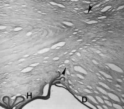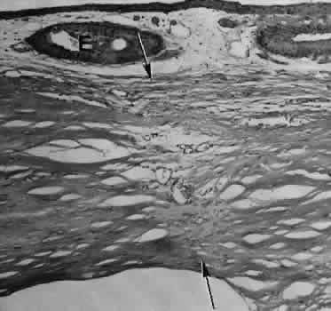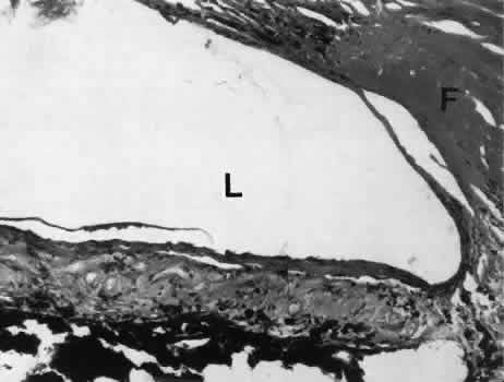 for more effective therapeutic intervention.86 Many complications originate from so-called surgical confusion (Fig. 24). Most arise from a lack of knowledge, a lack of judgment, or problems in perception. At times, lack of attention to detail in preoperative planning may lead to a drug reaction, inadequate anesthesia, misplacement of incisions and sutures, or a patient who is unable to control a cough reflex. What is recognized histologically as the immediate cause of the problem may well have its origin in improper planning of the procedure. CATARACT EXTRACTION Intraoperative Complications Complications occurring from the time the patient enters the operating room until the patient leaves the operating room are considered intraoperative.87,88 Misplacement of an anterior segment incision too far anteriorly into the cornea may create an unacceptable degree of scarring or astigmatism, whereas misplacement too far posteriorly (Fig. 25) may cause the incision to enter the ciliary body instead of the anterior chamber, an especially serious event in glaucoma filtering procedures. Misplacement oflimbal sutures (Fig. 26) may cause anterior wound gaping if placed too far posteriorly or posterior wound gaping if placed too far anteriorly. A deep suture may enter the anterior chamber and lead to wicking and a flat anterior chamber postoperatively. A suture placed at different depths in the two sides of the wound results in faulty apposition of the wound edges. Descemet's membrane is only loosely adherent to the posterior stroma and may be stripped into the anterior chamber at the time of the corneal incision placement (Fig. 27) or injection of sodium hyaluronate. Splitting off of Descemet's membrane from the posterior cornea can lead to postoperative intractable corneal edema.89,90 Intraoperative anterior chamber hemorrhage may result from an inadvertent iridodialysis or from the iridectomy wound. The site of hemorrhage is usually found along the scleral side of the cut edge of the wound. This type of hemorrhage rarely leads to serious clinical problems.91 Rupture of the posterior lens capsule (Fig. 28) increases the risk of vitreous loss and limits options for the implantation of an intraocular lens. Retention of lens capsular tissue or vitreous in the wound (Fig. 29) will significantly delay the wound healing process. Vitreous loss leads to an increased incidence of iris prolapse, bullous keratopathy, epithelial downgrowth, stromal overgrowth, wound infection and endophthalmitis, updrawn or misshapen pupil, vitreous bands, postoperative flat anterior chamber, secondary glaucoma, retinal detachment, cystoid macular edema, optic disc edema, vitreousopacities, vitreous hemorrhage, and other sight-threatening consequences.92 Damage to the endothelium during insertion or positioning of the lens was one of the most common problems with intraocular lens implantation until the widespread use of intraoperative viscoelastics. The endothelial cell damage may manifest on the first postoperative day as corneal edema. The course of the edema may wax and wane and ultimately result in pseudophakic bullous keratopathy months or years after surgery. Detachment of Descemet's membrane, inadvertent iridodialysis, cyclodialysis, or rupture of the posterior capsule also may occur during lens insertion and positioning. Expulsive choroidal hemorrhage (Fig. 30) is a rare catastrophic complication often resulting in total loss of the eye.93 The site of hemorrhage is probably a sclerotic choroidal arteriole where the vessel crosses the suprachoroidal space from the scleral canal. The sudden hypotension after surgical penetration of the globe causes a bending and then a rupture of the arteriole.94 Although most hemorrhages are massive and immediate, they occasionally are delayed, and some may not occur for days or weeks after surgery. Delayed choroidal hemorrhage may occur at the time of corneoscleral suture removal,95 because of clinically unapparent wound dehiscence or as a result of perforation of a corneal ulcer. Histologically, massive choroidal hemorrhagic detachment is associated with a retinal detachment. The retina and choroid may herniate through the scleral wound. A ruptured ciliary artery may be found in the suprachoroidal space. Postoperative Complications Postoperative complications may arise from the time the patient leaves the operating room until approximately 6 weeks after surgery.96 A flat anterior chamber is characterized by anterior displacement of the iris to near or in actual contact with the posterior surface of the cornea. The most common cause is leakage of aqueous along one of the suture tracks. Prolonged decompression of the anterior chamber increases the risk of synechiae formation and intractable secondary closed-angle glaucoma. Corneal endothelial damage may result in bullous keratopathy. Choroidal edema (choroidal hydrops or detachment) (Fig. 31) may be associated with a flat anterior chamber and may potentiate the condition. The choroidal edema will slow or stop aqueous production by the ciliary body, further delaying reformation of the anterior chamber. The histologic characteristics of choroidal edema consist of spreading of the choroidal tissue in a fanlike configuration and eosinophilic fluid filling the intervening spaces. The edema fluid may be lost in processing, leaving multiple apparently empty spaces. Iris or lens capsular incarceration into the wound and extending to the conjunctival space (Figs. 32 and 33) may act as a wick through which aqueous can escape, causing a flat anterior chamber. Histologically, iris, which is frequently recognized only by the presence of melanocytes, is seen in the limbal scar, in the limbal episclera, or in both areas. Vitreous wick syndrome consists of vitreous incarceration in the wound, where the vitreous may extend beyond the wound to the subconjunctival space or occasionally to the ocular surface.97 Anchoring of the vitreous anteriorly in this man