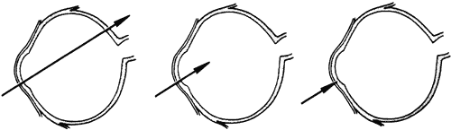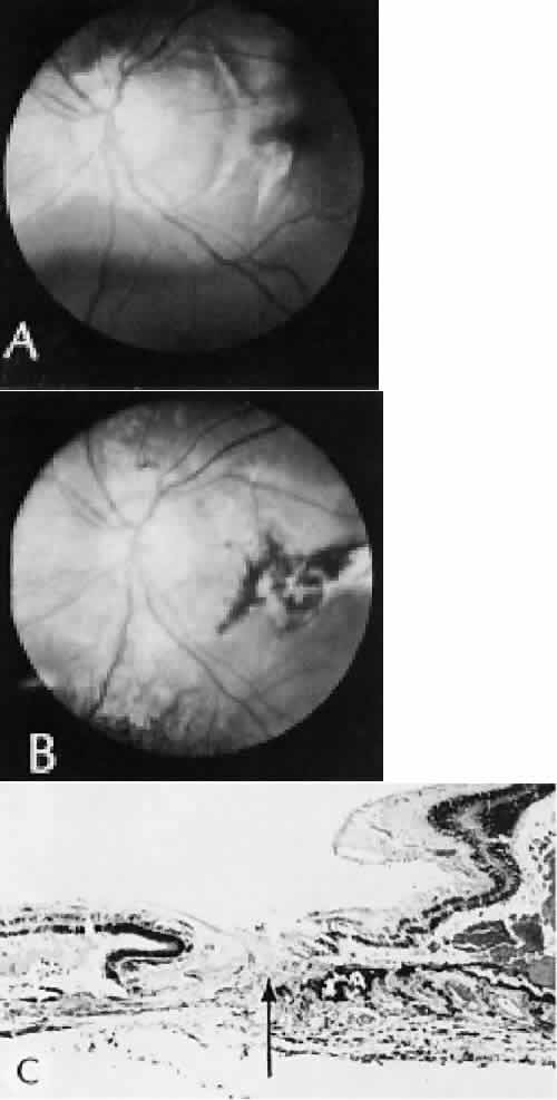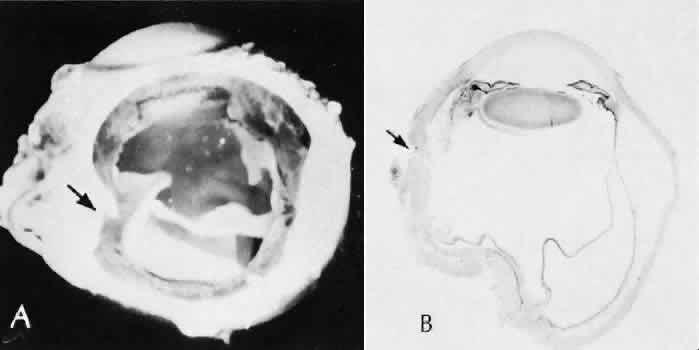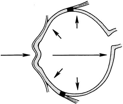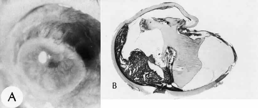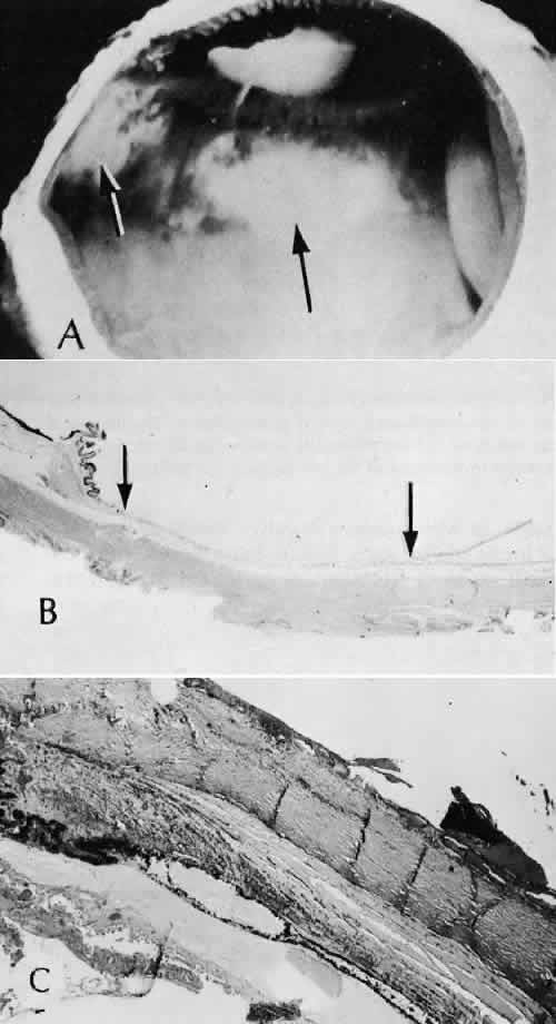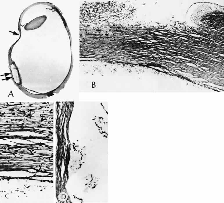 of agents may inflict different types of injuries of varying severity.159,160 One clinically useful classification of accidental ocular trauma is based on the type of injury; however, even in this classification, there are areas of overlap. Blunt trauma usually indicates that a small degree of tissue disruption exists. Penetrating or perforating trauma indicates a greater degree of tissue disruption. Intraocular foreign bodies imply a degree of tissue disruption often limited in extent but complicated by retention of some foreign material within the globe or accompanying microbial infection. Thermal and chemical injuries lead to special types of destructive processes. Radiation trauma usually produces vascular abnormalities but also may affect the crystalline lens. Finally, systemic trauma may indirectly affect the eye. BLUNT TRAUMA Compression and deformation of the eye are unusual occurrences because of the protection afforded the eye by the surrounding bones of the orbit, particularly the orbital rim. However, although no actual tissue loss occurs, the force of the blow may cause extensive injury to many of the delicate structures of the eye (Fig. 61).161 These same structures usually have only a limited ability to recover and repair the damage. Regions of the sclera are notably vulnerable to blunt trauma because of relative thinness. These areas include the limbus (Fig. 62), the insertions ofthe four rectus muscles, the insertion of the superior oblique, and the scleral canal (Fig. 63). Cornea Corneal epithelial abrasions may be large but usually will heal without serious sequelae. Deeper corneal involvement may result in focal areas of epithelial proliferation (facet formation, see above) or scar formation of the stroma. Endothelial cell distortion or rupture may result in multiple small ring opacities of the endothelium.162 The endothelial lesions become visible immediately after injury and become progressively more opaque over several hours. Depending on the degree of injury, the rings may disappear within days and result in no permanent loss of visual acuity. Histologically, swelling of the corneal endothelium and accumulation of fibrin and leukocytes on the injured endothelial cells cause the rings.163 More extensive endothelial cell damage is associated with stromal edema. Ruptures of Descemet's membrane allow aqueous to hydrate corneal stroma, which is normally relatively dehydrated. The swelling of the cornea reduces its transparency (corneal hydrops). The edema may resolve once the endothelial function is reestablished.164 Birth trauma is a common cause of rupture of Descemet's membrane. The area of rupture is often oriented diagonally across the central cornea.165 Histologically, whether the rupture is the result of birth trauma, congenital glaucoma, or trauma anytime after birth, a gap is seen in Descemet's membrane.166 The endothelium usually will migrate over the gap and form a new, thin Descemet's membrane. The time required for clinical improvement is generally between 6 weeks and 6 months.167 In attempting to cover the gap, the endothelium may grow into the anterior chamber over the free, rolled end of the ruptured Descemet's membrane and form a scroll-like structure.164 Corneal hydrops may also be complicated by corneal neovascularization167 or, rarely, by intralamellar pseudocyst formation.168 Keloid of the cornea (Fig. 64) is a hypertrophic scar that occasionally develops after ocular injury. Most keloids appear as glistening white masses that extend outward from the eye in the region of the cornea. Histologically, corneal perforation generally is present. Haphazardly arranged fibroblasts, collagen bundles, and blood vessels form the corneal scar.169,170 Anterior Chamber171 Blood in the anterior chamber (hyphema) may lead to a number of secondary complications.172–174 Even a small amount of blood in the anterior chamber is a clinically significant finding because its presence indicates the possibility of serious intraocular damage. In addition, there is a risk of a secondary (delayed) and often more serious hemorrhage occurring at the time of clot retraction.175 If the hemorrhage is extensive, the blood may totally fill the anterior chamber and completely replace the aqueous (8-ball or blackball hyphema).176 The extravasated blood will turn from bright red to black as the aqueous circulation ceases and the hemoglobin becomes deoxygenated. Multiple mechanisms in the setting of hyphema may lead to secondary glaucoma.177 Anterior chamber hemorrhage in hemoglobin sickle cell disease or in vitreous hemorrhage with access to the anterior chamber (hemolytic or ghost cell glaucoma) may cause occlusion of the trabecular meshwork. The sickle cell and ghost cell erythrocytes are rigid and cannot be filtered efficiently through the trabeculum. Macrophages filled with hemoglobin in sufficient quantity may also cause decreased aqueous filtration. A blood clot itself may tamponade the meshwork in the peripheral anterior chamber and cause pupillary block centrally. These mechanisms, which occur in the early posttraumatic period, are potentially reversible. In the chronic phases of healing, however, fibrous organization of a clot, fibrosis of the trabecular meshwork, endothelialization of the trabecular meshwork, or peripheral anterior synechiae formation may lead to permanent secondary glaucoma (Fig. 65). Blood breakdown products from hyphema may diffuse into the cornea and cause a reddish orange opacification of the stroma (blood staining of the cornea). The extent of the deposition of hemoglobin depends on the degree of damage to the endothelium and on the degree of increase in the intraocular pressure.178 With sufficient damage to the endothelium, bloodstaining may occur even at low levels of intraocular pressure. Histologically, hemoglobin particles can be seen by routine stains to be distributed throughout the corneal stroma. Hemosiderin, a metabolic product of hemoglobin, 