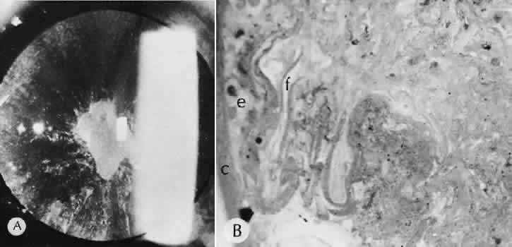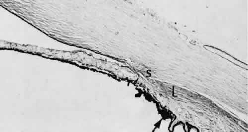CATARACT EXTRACTION The cataract incision is made into the anterior chamber in such a way as not to injure the trabecular meshwork or unduly injure the cornea. The traditional cataract wound extends from the episcleral tissue posterior to the surgical limbus (defined by the insertion of the conjunctiva and Tenon's capsule) through the corneoscleral tissue to enter the anterior chamber by perforating Descemet's membrane anterior to Schwalbe's line. Clear corneal cataract incision involves only the peripheral cornea. Special circumstances may occur in which a more posterior or anterior route of incision may be desirable.55,56 The most reliable histologic landmark of a healed cataract incision (Fig. 14) is a hiatus of peripheral Descemet's membrane. The cut edges of Desce-met's membrane will curl inward toward the sclera.Endothelial cells may be absent or may have produced a new, thin, periodic acid-Schiff-positive Descemet's membrane over exposed corneal stroma. Occasionally, a fibrous plaque is present at the level of Descemet's membrane. This plaque is another example of fibrous metaplasia, in this instance of the corneal endothelial cells. The corneal stromal portion of the wound may be difficult to identify histologically, except in the early stages of healing. Clues to the position of the intrastromal tract include residual suture material, malorientation of collagen bundles, vascularization along the route of the incision, or incarceration of pigment, lens capsular remnants, or fragments of Descemet's membrane. The superficial portion of the wound tends to heal most completely. Breaks in Bowman's membrane will be present at the site of suture tracts and clear corneal cataract incisions. Also, areas of epithelial cell inclusion may be present in the substantia propria of the conjunctiva at the conjunctival incision. The capsulotomy incision is anterior to the insertion of the zonules through a relatively thick area of the anterior capsule. Most of the lens epithelial cells are removed with the anterior capsule, although some cells may remain in the region of the equator of the lens (Fig. 15). The residual lens capsule is thinnest at its posterior pole. The anterior capsular flap often adheres to the posterior capsule, encasing any residual cortical material and lens epithelial cells. Lens epithelial cells may grow to form large cells, called bladder cells, or may undergo fibrous metaplasia to form a collagenous plaque. Lens cortex outside the lens capsule has an amorphous appearance and is present only in the earliest postoperative specimens. Peripheral iridectomies are peripheral to the iris sphincter in the midportion of the iris rather than at the less accessible iris base. Complete or sector iridectomies include the iris sphincter but do not extend to the iris base. The edges of an iridectomy may show some rounding of contours, but granulation tissue does not form and iris pigment epithelial proliferation does not generally occur. The iris pigment epithelium may be absent for a considerable distance from an iridectomy produced by laser energy. Intraocular lens material (polymethylmethacrylate) often dissolves during tissue processing. Intraocular lenses containing metal components must be removed before embedding because metal will cause extensive artifacts and damage to microtome knives. Often the only clues to the presence of an intraocular lens are subtle compression changes of the iris or ciliary sulcus. Occasionally, residual synthetic material can be identified by polarized light. Anterior chamber lenses may cause a fibrous reaction in the anterior chamber angle (Fig. 16). Occasionally, collagenous tissue will completely encircle a lens (Fig. 17). Iris-supported lenses are associated with the loss of central iris pigment epithelium or residual nylon suture in the posterior chamber. Posterior chamber lenses are the most difficult to identify unless surrounded by lens remnants, in which case a negative image of the optic or loops can be seen. Sulcus-fixed lenses will show focal areas of iris pigment epithelial depigmentation or iris stromal erosion. The lens loop may displace the peripheral iris to come in contact with the trabecular meshwork. PENETRATING KERATOPLASTY Penetrating keratoplasty is a confusing term. The reference point of the incision is the globe; therefore, when a full-thickness graft is performed, the incision penetrates the globe but perforates the cornea. The concave-convex specimen usually is 7.0 to 8.5 mm in diameter and translucent because of fixation. Gross orientation of the specimen is important if pertinent changes are to be represented in the histologic section. Occasionally, as in keratoconus, the graft is placed axially and causes the pathologic area of thinning to be in an eccentric position in the graft. The area of the cone can be detected by observing the shadow of the specimen cast by a strong light. Descemet's membrane will not curl as extensively toward the stroma, as seen with in vivo wounds. Occasionally, Descemet's membrane is lost during tissue preparation because the membrane is easily sheared free of the corneal stroma. With repeat penetrating keratoplasty operations, the original corneal incision may or may not be represented in the specimen because of variations of size and position of the second graft procedure. Penetrating keratoplasty wounds in enucleation specimens can be identified by the changes in Descemet's membrane (Fig. 18). Because the donor tissue is often from a younger person, Descemet's membrane of the graft is thinner than the peripheral membrane of the host. Occasionally, redundant Descemet's membrane from the host intentionally will be left behind in this region by the surgeon. Often small areas of retrocorneal fibrous plaque mark the posterior area of the wound, even in cases of clinically uncomplicated wound healing. In time, the stromal portion of the wound may be undetectable histologically although some malorie