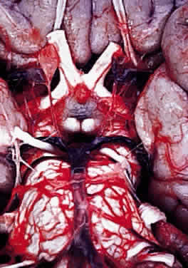 BLOOD SUPPLY OF THE OPTIC NERVE Central vessels penetrate the optic nerve 8 to 15 mm behind the globe, having crossed the meninges to lie nasal to the nerve. The vein follows a course of variable length before entering the nerve. The artery penetrates the nerve at the same level or anterior to the vein (Fig. 7). Arrangement of arterial branches within the nerve varies between individuals and branches are from ophthalmic, posterior ciliary, central retinal artery (within orbit), and branches from the circle of Zinn-Haller. The intraocular portion of the nerve receives branches from the intracranial portion of the ophthalmic artery, anterior cerebral, internal carotid, and ophthalmic arteries.13,14