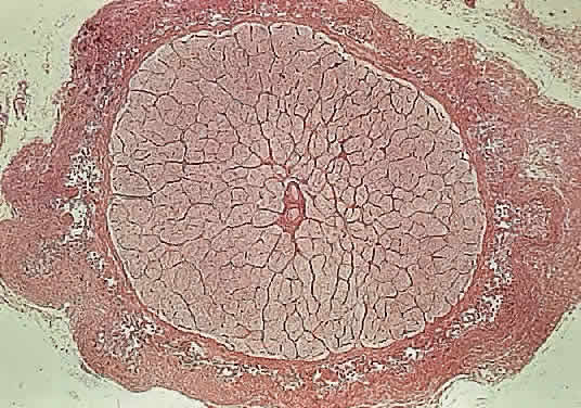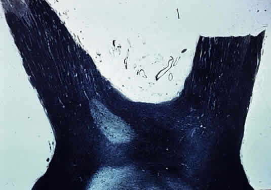 Transverse Inflammation that extends from the meninges into the pia affects the peripheral nerve bundles. A continuous exudate, such as is seen in a granulomatous inflammation due to fungi or acid-fast bacilli, leads to atrophy of the peripheral nerve bundles and thus a periaxial atrophy. In axial neuropathy, the macular fibers are predominantly affected. These fibers are particularly susceptible to involvement in multiple sclerosis and in tobacco or alcohol amblyopia. Both periaxial and axial forms may extend and affect the optic nerve transversely. Papillitis refers to inflammation of the disc; it is usually accompanied by a vitreous haze due to the presence of inflammatory cells. Commonly, it is seen with suppurative endophthalmitis and panophthalmitis. The disc shows edema, perivenous cuffing by chronic inflammatory cells, and astrocytic proliferation. Thin bands of connective tissue may spread from the disc surface into the vitreous and cover the adjacent retina. Loss of myelin may occur with all the pathologic processes described above and also with trauma and neoplasm; this type of demyelination is secondary. Primary demyelination refers to demyelinating disease of unknown etiology (Figs. 24 and 25). Loss of myelin occurs early but initially the axons are undamaged (disseminated sclerosis, acute disseminating myelitis), so that visual function may return. The damaged myelin is removed by macrophages followed by astrocytic proliferation, which produces a glial scar or plaque (Fig. 26).