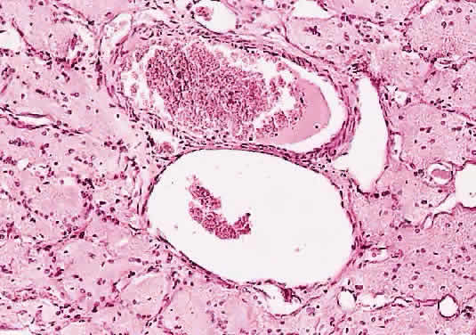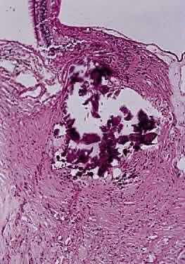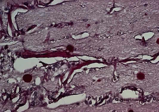 The entity known as “cavernous optic atrophy of Schnabel” is characterized microscopically by large cystic spaces that are posterior to the lamina cribrosa. In these areas, the nerve fibers are destroyed and the cavernous spaces are filled with acid mucopolysaccharide-positive material (Fig. 33). Neither gliosis nor mesenchymal reaction are evident. This intracystic material was initially thought to be vitreous that penetrated into the parenchyma through the internal limiting membrane of the optic nerve head. The condition, however, is an acute infarction of the nerve secondary to acute glaucoma, vascular disease, or “deficient oxygenation states” (hypotension).