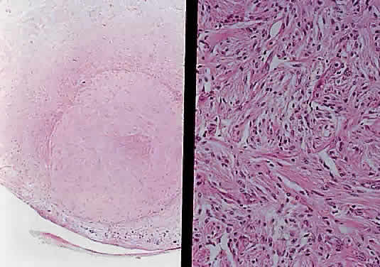 Histologically the common types of meningioma include the meningotheliomatous, transitional, fibroblastic, and psammomatous meningiomas. In most instances, the cells bear some resemblance to arachnoid cells (Fig. 44). Variations in their cytologic features and architectural arrangements produce a broad spectrum of microscopic appearances. The most common type within the orbit is the meningotheliomatous type that is composed of lobules and sheets of neoplastic cells with typically indistinct cell borders (syncytial arrangement). The ultrastructural basis for this latter phenomenon is the complex interdigitation of cytoplasmic extensions. Individual nuclei are oval with light-staining chromatin and small nucleoli. Intranuclear cytoplasmic pseudoinclusions are usually readily evident. The cytoplasm is uniform and lightly eosinophilic. Whorls of cells, in which the cells arrange themselves in concentric layers akin to the layers of an onion, are found in nearly all meningiomas and are one of the most helpful diagnostic features (Fig. 45) Psammoma bodies—concentric laminated mineralized concretions typically centered on whorls—are present in varying number in most meningiomas; when particularly abundant, the tumor is referred to as a psammomatous meningioma.