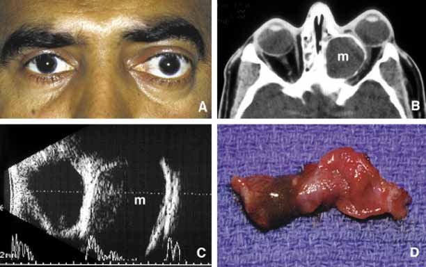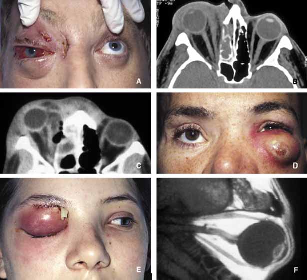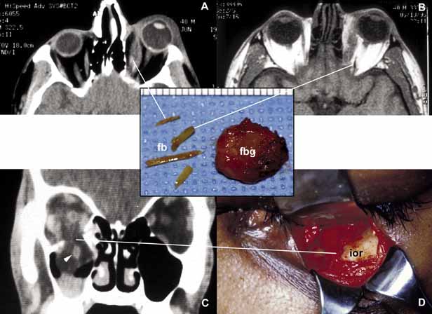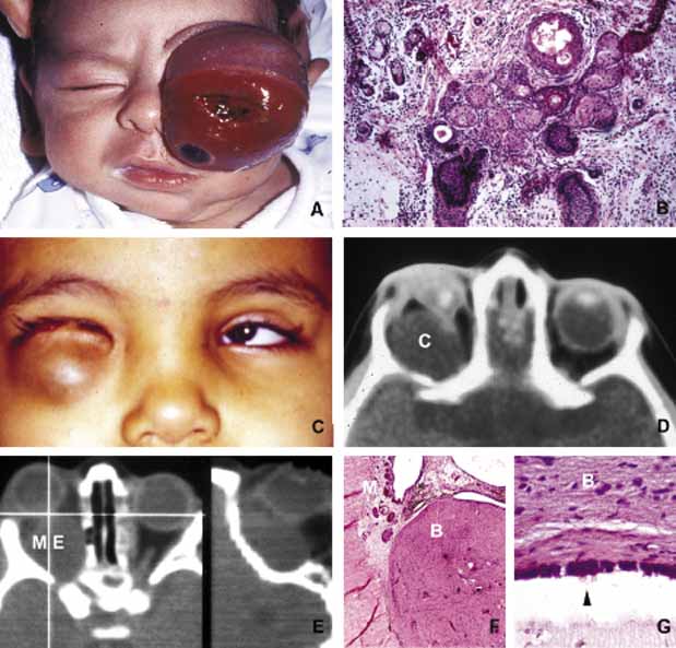 ANOPHTHALMOS/MICROPHTHALMOS When the globe is abnormally developed, microphthalmos, congenital cystic eye, and extremely rarely, anophthalmos occur. Microphthalmos usually occurs as a unilateral condition and in approximately 10% of cases it is associated with other craniofacial malformations including agenesis of the corpus callosum, polymicrogyria, and mid-line arachnoidal cysts. Microphthalmos may be seen as a part of several genetically determined neuronal migration disorders such as Walker-Warburg syndrome, Aicardi syndrome, and Fukuyama congential muscular dystrophy.9,10 In cases of microphthalmos and anophthalmos the orbit may be well formed but does not develop to a full adult volume. The mechanism by which the presence of the globe effects the growth of the orbit is not well understood. Microphthalmos may be associated with a colobomatous cyst as a result of the abnormal closure of the embryonic optic fissure leading to the prolapse of neuroectodermal tissues into the orbit (Fig. 1) This cystic structure may increase rapidly in size to overshadow the abnormal globe and may be confused with a neoplasm. When cystic lesions in the orbit are suspected imaging studies should be performed not only to look for other intracranial abnormalities but also to establish the possible connection of the cyst to the colobomatous globe versus to abnormally formed meninges.11 Macrophthalmos (buphthalmos) may also rarely develop as a congenital anomaly in patients with Sturge-Weber syndrome and rarely in neurofibromatosis type I. ORBITO-CRANIAL MALDEVELOPMENTS Cephalocele results from the extension of maldeveloped CNS tissues including meninges (meningocele), brain parenchyma (encephalocele), and the combination of the two (meningoencephalocele) into the orbital cavity.12,13 Intraorbital cephaloceles may develop anteriorly at the suture lines of orbital bones or posteriorly extending into the orbit from orbital fissures and the optic canal. Depending on the combination of these herniations they contain brain and/or meningeal tissues (Fig. 1). Aberrant fibroglial tissue has also been described in the orbit.14 Hamartoma is a tumor-like proliferation of tissues that normally exist at a given body location. The best examples of orbital hamartomas are the vascular hamartomatous lesions that are composed of vascular elements including capillary endothelial cells, distended or collapsed cavernous blood and lymph vessels, tortuous arterial and venous channels with or without anastomoses, etc. Other examples of hamartomatous orbital tumors include neurofibroma and lipomatous hamartoma.15 Choristoma, however, is a tumor-like proliferation of tissues that are not normally present at a given body location. The most commonly encountered example of orbital choristoma is a dermoid.16 Dermoids that present with many varieties result from the entrapment of epithelial structures at the site of closure of fetal fissures. Superficial dermoid cysts occur primarily subcutaneously anterior to orbital septum or within the anterior orbit. If the cyst wall is made of epidermis without dermal tissues, it is classified as an epidermoid cyst. These lesions are occasionally lined by conjunctival or pseudostratified respiratory epithelium.17 The superficial lesions must be distinguished from deep orbital dermoids that are usually rounded, encapsulated tumors filled with fatty materials, keratin, and dermal structures such as hair particles. Histopathologically the dermoid wall is lined by keratizing squamous epithelium with dermal appendices including hair follicles and sebaceous and eccrine glands.18 Most of the dermoids are well outlined by ultrasonography because of their anterior location thus making CT or MRI rarely necessary.19 If the dermoid is unusually large or located at the frontal zygomatic suture, CT is necessary to document the relationship of the lesion to the bone before surgical intervention. Rarely, dermoids at the fronto-zygomatic suture may develop dumbbell-shaped lesions partially within the orbit and partially extending into the temporal fossa.20,21 Unusually large superior orbital dermoids particularly those that leak and create granulomatous reaction within adjacent soft tissues may erode the bone and extend into the frontal sinus or the cranium (Fig. 2). ORBITAL TERATOMA Teratoma is a germ-cell tumor that contains tissues derived from endoderm, ectoderm, and mesoderm22 (Fig. 1). Therefore, these lesions may contain skin, bowel, lung, brain, thyroid, cartilage, and bone tissues. Most teratomas develop unilaterally and in girls. A majority of these congenital tumors are benign. Occasional reports have documented malignant transformation within orbitocranial teratomas.23 However, these benign tumors continue to grow after birth because of the collection of secretions from different tissues into the partially cystic spaces of the tumor. Some teratomas create massive proptosis and most can only be treated by exenteration. However, some of these lesions have recently been reported to be removed surgically with preservation of the globe and other vital orbital structures. TRAUMA Mechanical Injury Orbital injuries result from the absorption of kinetic energy that occurs whenever the orbital tissues contact an object moving at a different speed.25 The orbital rim is capable of absorbing a considerable amount of kinetic energy without being fractured. Yet, a variety of impact forces striking the orbit may result in fractures in different areas.26 The absorption of the kinetic energy by an orbital bone may lead to contusion and/or laceration of the skin and superficial soft tissues, local deformation of the adjacent structures, globe, orbital soft tissues and bones and increases pressure in the orbital cavity. A common end result of an orbital impact is the fracture of the floor and/or the medial wall (lamina papyracea)27 (Fig. 3). Fractures of other orbital bones occur less often. Foreign bodies may be introduced 
