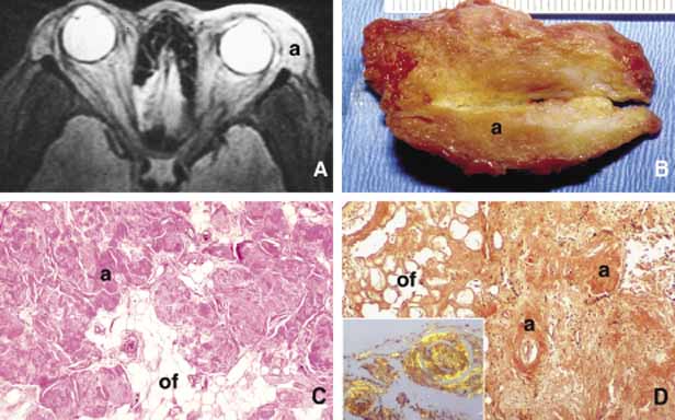 AMYLOIDOSIS Clinical features of orbital amyloidosis include proptosis and ocular motility disturbance and upper lid ptosis secondary to soft tissue infiltration322 (Fig. 36). The amyloid diseases are a diverse group of disorders, which can present as hereditary or sporadic forms. In these diseases, a hyaline material that is known as amyloid is deposited extracellularly in many tissues including fat, skeletal muscle, neural tissues, kidneys, adrenal glands, and, rarely, in the orbit.323 Orbital disease is manifested in most instances as a part of a systemic disorder such as multiple myeloma, rheumatoid arthritis, tuberculosis, etc.323,324 The most common types of amyloidosis are associated with multiple myeloma and primary amyloidoses. In plasma cell dyscrasias, a so-called protein AL is deposited in the affected tissues. In the primary amyloidosis, however, the deposited protein is known as AA, an amyloid derived from serum protein A and alpha-1 globulin. Both deposits AA and AP are insoluble, abnormal proteins and when they accumulate within the tissues, the normal architecture is distorted and thereby the tissue becomes dysfunctional. Under the light microscope the tissue deposits of amyloid appear as homogeneous, eosinophilic, hyaline material that stains orange/red with Congo-red technique and reveals a characteristic apple green birefringe under a polarizing filter. Amyloid deposits are also identified with crystal violet and thioflavin-T stains as well as with immunohistochemical stains that are specific for the AP and AA proteins.325 Ultrastructural examination reveals characteristic 6 to 10 nanometers branching fibrils arranged in a haphazard fashion without a distinct periodicity.326 In contrast with the systemic disease, focal amyloidosis in the orbit is a very rare disorder and may present as either a mass lesion or a diffuse infiltration involving fibroadipose tissues, lacrimal gland and/or extraocular muscles.327,328 The localized deposition of amyloid within the lacrimal gland presents with the enlargement of the gland, molding to adjacent structures and frequently with punctate calcification that is best depicted with CT.329 With MRI, amyloid deposits reveal low signal on T2-weighted images. With both CT and MRI, amyloid deposits demonstrate virtually no contrast enhancement with gadolinium.327 Extramedullary plasmacytomas occasionally may mimic amyloidosis when they are localized in the lacrimal and salivary glands.330 COLLAGEN TISSUE DISEASES Lupus erythematosus,331,332 dermatomyositis,333–335 rheumatoid arthritis,336,337 scleroderma,338–340 polyarteritis nodosa,342,343 angiolymphoid hyperplasia (Kimura disease),344–347 Behçet disease,348 and Churg-Strauss syndrome.349 are also known to involve orbit occasionally, and form diffuse and/or localized inflammation. ENOPHTHALMOS In great majority of orbital diseases, patients develop proptosis and displacement of the globe. It is important to remember, however, that in certain conditions the clinical presentation may be just the opposite, namely, the patient develops enophthalmos instead of exophthalmos.350,351 Enophthalmos (posterior/inferior dislocation of the globe) may occur with two basic mechanisms: structural abnormality, most commonly secondary to penetrating or nonpenetrating trauma with fractured orbital walls, and fibrosis of the orbital soft tissues, secondary to a number of pathological causes, including chronic inflammation, radiation degeneration, neoplasia, etc. The structural abnormality may also be related to a congenital malformation of the sphenoid bone in neurofibromatosis. If the bony defect is large enough, the globe may develop enophthalmos. Last but not least, orbital fibroadipose tissue may develop scarring and atrophy secondary to a number of diseases including scleroderma, radiation exposure, aging, and lipodystrophy.352 |
