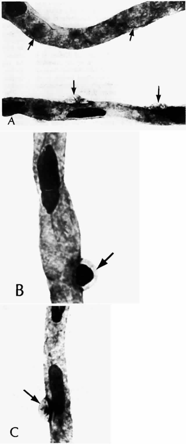 Arteriosclerotic changes in the choroidal vessels are more common in diabetic patients than in matched nondiabetics. These changes include fibrosis and hyalinization of the media with plaque formation in larger vessels.18 The choriocapillaris shows diffuse thickening of the basement membrane, sometimes to the point of total vascular occlusion. Both pericytes and endothelial cells appear to participate in this process of excess basement membrane synthesis. The obliterated capillaries form eosinophilic nodules that superficially resemble drusen, although they are on the choroidal side of Bruch's membrane. They also resemble the nodules seen in kidneys of patients with diabetic glomerulosclerosis.24 Two patients in Hidayat and Fine's series,24 both less than 30 years old and who had not been treated with photocoagulation, showed peripheral subretinal neovascularization, one near the equator and one near the ora. The significance of this finding is uncertain. |