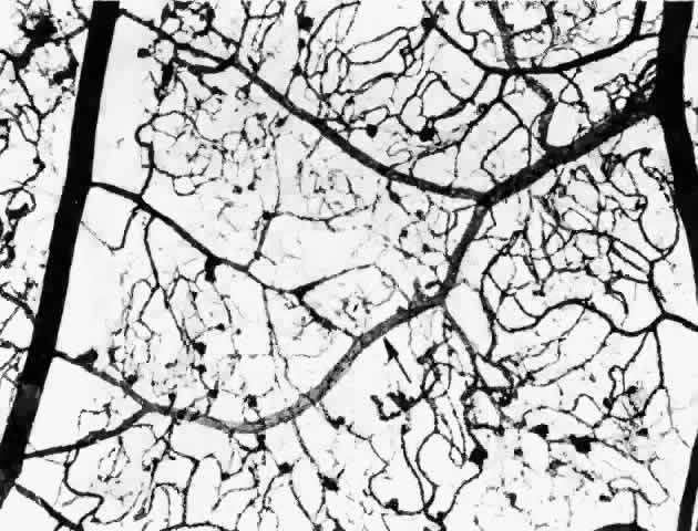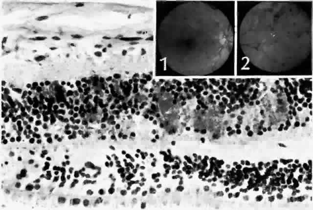 All of these changes are forerunners of proliferative retinopathy. Patients are unlikely to develop proliferative retinopathy before 10 years' duration of diabetes, but thereafter the incidence rises steadily.31,32 Rarely, proliferative retinopathy with vitreal hemorrhage can be the presenting sign in younger patients.48 As in other diseases associated with retinal neovascularization, the stimulus for new vessel formation in diabetes appears to be ischemia. The retina is uniquely dependent on oxygen: its demand on a unit-to-weight basis exceeds that of all other tissues, including the brain.7 A number of growth factors may act on the retina, including somatomedin C (insulin-like growth factor I), platelet-derived endothelial growth factor, fibroblast growth factors, angiogenin, and others.49 According to one recent study of samples of neovascular membranes obtained at vitrectomy from diabetic patients, only vascular endothelial growth factor was present in all specimens.50 This same factor is also present at significantly higher levels in the vitreous in eyes with proliferative retinopathy than in those without the disease.51 The precise role of the different factors in the promotion of neovascularization remains to be elucidated. New vessels that develop on or within a disc diameter of the optic nerve head are termed new vessels at the disc (NVD) (Color Fig. F). Those that develop anywhere else on the retina are called new vessels elsewhere (NVE). NVD indicate a diffuse retinal ischemia, whereas with NVE, the ischemia may be more localized, occurring at a site of previous arteriolar closure or capillary dropout. NVE can occur peripherally as well as in the posterior pole.52 Histologically, new vessels develop between the retinal surface and the posterior surface of the formed vitreous (Fig. 12). With NVE, there is a demonstrable break through the internal limiting membrane (Fig. 13).20 Early-developing new vessels have lumina even at the proliferating tips.53 Active new vessels have endothelial cells and pericytes, with fenestrations. Morphologically, fenestrations are areas ranging from 40 to 80 nm in diameter where the cell membranes are focally fused, and are normal findings in capillaries outside of the retina and brain. They allow increased permeability and are responsible for the diffuse leakage of fluorescein seen from new vessels on angiography. Inactive or “ghost” new vessels are acellular, having lost both endothelium and pericytes.39 With time, fibrous tissue develops and accompanies the new vessels. The vessels themselves may leak and bleed into the vitreous, leading to visual loss. The fibrous tissue is contractile, and has been shown to contain actin filaments.54 Clinically, fibrous proliferation appears as whitish bands on the retinal surface, sometimes obscuring the neovascularization. With retinal elevation, retroretinal membranes also can form. Traction can cause cystoid changes in the retina20 and venous loops,55 as well as retinal detachment (Color Fig. G). Extensive traction can cause macular heterotopia reminiscent of retinopathy of prematurity.56 Histologically, the cells in the membranes appear to be fibrous astrocytes. At least in some cases, however, there is immunohistochemical evidence that cells of Müller can also migrate and form membranes. Intraretinal migration and replacement of outer retinal layers by cells of Müller can appear clinically as retroretinal proliferation.57 Other cells found in preretinal membranes include inflammatory cells (i.e., lymphocytes, plasma cells, and macrophages) and retinal pigment epithelial cells.58 Panretinal photocoagulation, usually accomplished with an argon laser, is used to treat neovascularization of the retina and iris. The Diabetic Retinopathy Study Research Group59 has established the efficacy of this procedure in preventing severe visual loss, a measure that appears to last for at least 15 years.60 Radiant energy in the visible spectrum passes through the transparent retina and is absorbed by melanin pigment, hemoglobin, or both, depending on the wavelength chosen. The result is a focal scar of the outer retina, or if intense enough, full-thickness retina (Fig. 14).61 Full-thickness scars can cause extensive visual field loss because of obliteration of the nerve fiber layer.20 The choriocapillaris is effectively closed by photocoagulation, as demonstrated by studies of vascular casts.62 After panretinal photocoagulation, the oxygen tension on the inner retinal surface is greater over areas of scarring compared with adjacent areas of intact retina, presumably due in part to greater oxygen diffusion from the larger vessels of the choroid. The increased oxygen levels appear to alleviate retinal ischemia and help explain how photocoagulation causes retinal neovascular regression.63 This finding has been substantiated by direct measurements of oxygen tension in human patients undergoing vitrectomy.64 In the juxtafoveal area, krypton red was associated with less inner retinal damage than argon green.65,66 This is of clinical importance in the treatment of macular edema. The wavelength used, however, appears to be unimportant in extrafoveal areas of the retina.66 Macular grid photocoagulation has been proposed as an effective way to treat macular edema when specific leaking points cannot be identified. In animal studies, this technique appeared to work by occluding some capillaries and reducing the lumen in others, thereby decreasing the ratio of the retinal capillary area to the retinal area. The photoreceptors and retinal pigment epithelium were initially damaged but later recovered.67 |