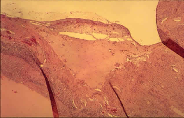 to death,19 whereas others have been less convinced of such a relationship.20 See Color Plate 1 for Color Figs. A through G These glycogen vacuoles can rupture when the intraocular pressure is suddenly reduced, resulting in a cloud of pigment granules carried anteriorly in the aqueous fluid. This pigment may then be phagocytosed by the corneal endothelium. The pupils of patients with diabetes often dilate poorly, and the amount of glycogen in the pigment epithelium may correlate to damage to the dilator muscle. Rubeosis iridis is a clinical term for the reddish discoloration imparted by neovascularization of the iris surface. It is associated most frequently with retinal ischemia and neovascularization, and indicates the presence of a diffusible vascular proliferative factor secreted by the retina.21 Initially, the vessels can be quite difficult to see. With more advanced rubeosis, there may be ectropion uveae, an eversion of the posterior iris surface at the pupil margin. The earliest location of the new vessels has been a matter of longstanding debate. They appear at the pupil margin and in the angle virtually simultaneously, subsequently spreading across the iris surface, but gonioscopic examination is required for the vessels to be seen in the angle. In some patients, the vessels do form in the angle before being perceptible at the pupil margin.22 Peripheral anterior synechiae form rapidly after neovascularization of the iris, closing off the trabecular meshwork and giving rise to so-called neovascular glaucoma, which is difficult to treat. In addition, the vessels and associated fibrous tissue can proliferate across the pupil, sequestering it. Particularly in aphakic patients, the vessels can also extend through the pupil and onto the posterior iris surface. Histologically the new vessels are located anterior to the anterior border layer of the iris (Fig. 3, Color Fig. B). They are thin-walled, unlike the normal thick-walled iris stromal vessels. New vessels may be located only at the pupillary margin and in the angle at the iris root, corroborating the clinical finding.18 Scanning electron microscopy has disclosed a thin, transparent layer of myofibroblastic proliferation anterior to the new vessels. This explains the clinical observation that the anterior iris surface appears smoothed out, with loss of the collarette and crypts typically seen on the normal iris surface. Myofibroblasts have contractile properties and thus may be responsible for the angle closure of neovascular glaucoma and also for the eversion of the posterior iris surface at the pupillary margin (Color Fig. C).23 |