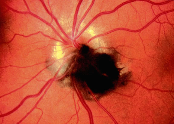 MELANOCYTOMA A melanocytoma is a characteristic type of uveal nevus that is composed of plump, polyhedral nevus cells filled with copious quantities of maximally pigmented cytoplasm.10,11 Melanocytomas also are called magnocellular nevi.12 In contrast to most nevi, melanocytoma may be relatively large and may be difficult to distinguish clinically from melanoma. Although best know as a pigmented lesion of the optic disc (Fig. 4), melanocytoma can arise from the stroma of the iris, ciliary body, or choroid13, 14, 15 (Fig. 5). Clinically, melanocytomas are intensely pigmented and often occur in young patients. Unlike uveal melanoma, they do not have a predilection for Caucasians; 37% to 50% of optic disc melanocytomas have been reported in African Americans.10,16 Melanocytomas of the iris are uniformly dark brown in color and often have an irregular friable surface.