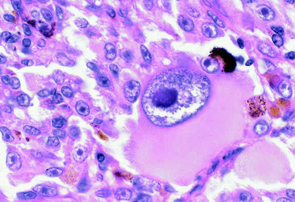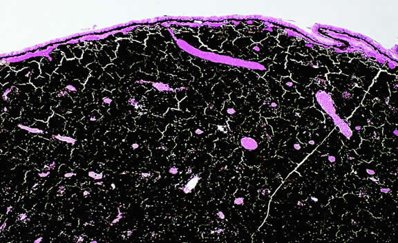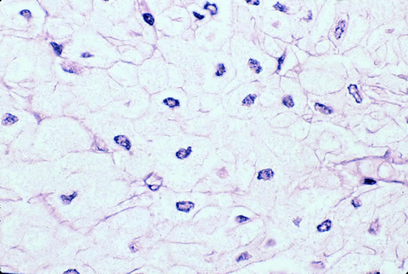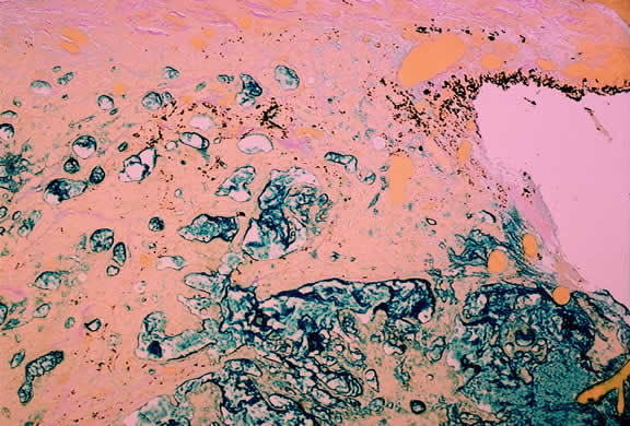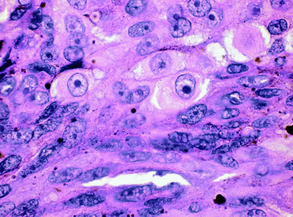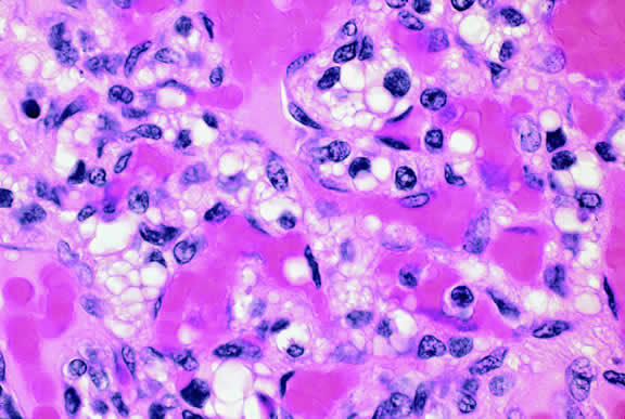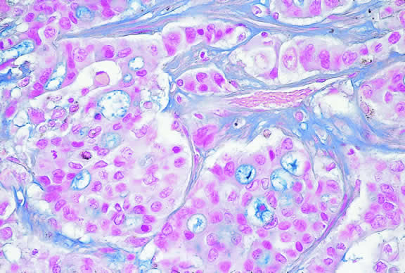 Microscopically, the uveal stroma is infiltrated by nest, cords, islands, and sheets of tumor cells whose general appearance and arrangement is dependent on the identity of the primary neoplasm. Most of the breast and lung tumors that metastasize to the eye are mucous-secreting adenocarcinomas. In such cases special stains such as Alcian blue, PAS, or mucicarmine are used to demonstrate the presence of intracytoplasmic mucin (Fig. 52). In most instances the pathologist can readily distinguish between a primary uveal melanoma and metastatic carcinoma in routine sections. Immunohistochemistry may be helpful in exceptional cases. Carcinomas are distinguished by positive immunoreactivity for epithelial markers such as cytokeratins and epithelial membrane antigen. Most melanomas stain with S-100 protein and vimentin and a variety of other markers including so-called melanoma specific antigen HMB-45, melan A, and microphthalmia factor. Occasionally, immunohistochemistry can confirm or provide clues to the identity of the primary tumor by demonstrating the presence of tumor specific antigens such as prostate specific antigen (PSA) in prostatic carcinoma or thyroglobulin in thyroid. Distinguishing between a primary uveal melanoma and choroidal metastasis from skin melanoma or another primary nonocular pigmented neoplasm may be challenging.197,198