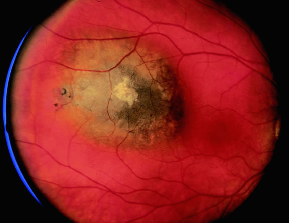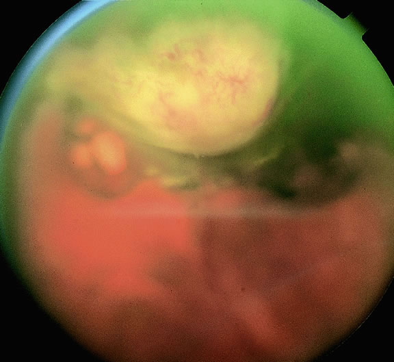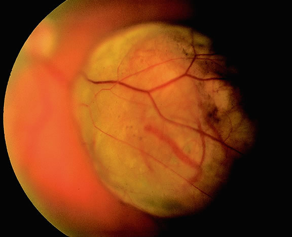 Necrotic melanomas may present with severe orbital and adnexal inflammation that can mimic infectious cellulitis or idiopathic orbital inflammation.48 Extensive necrosis typically is found in eyes with rapidly growing high-grade tumors. Marked elevation of intraocular pressure in eyes with secondary glaucoma may cause infarction of the tumor and other intraocular structures. Unsuspected melanomas occasionally are discovered when blind painful eyes with opaque media are examined pathologically. Before the advent of ultrasonography as many as 10% of blind painful eyes were said to harbor previously undiagnosed tumors.79 The possibility of a tumor should always be entertained when cataract is unilateral or asymmetric. It is quite embarrassing to diagnose a melanoma during cataract surgery. CLINICAL SIGNS. Ophthalmoscopic examination of a choroidal melanoma typically reveals a sessile or dome-shaped pigmented mass located deep to the retina (Figs. 16, 17, and 18). There often is an associated secondary nonrhegmatogenous serous detachment of the retina. Orange pigment may be located on the surface of smaller lesions.80,81 Tumors vary in pigment content and may be heavily pigmented or totally amelanotic. The differentiation of a totally amelanotic melanoma from uveal metastasis, hemangioma, lymphoma, or osteoma may be difficult. Compared with metastasis, melanoma usually is more highly elevated and drusen and RPE proliferation more evident on its surface. Ophthalmoscopy also typically shows well-defined vessels within melanoma.48 Ancillary studies such as fluorescein angiography and ultrasonography may be necessary to make the diagnosis.