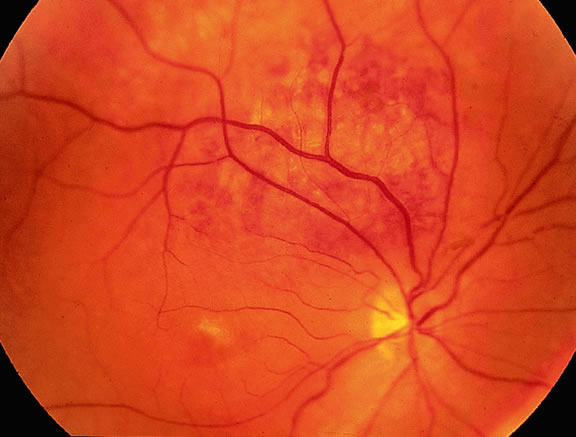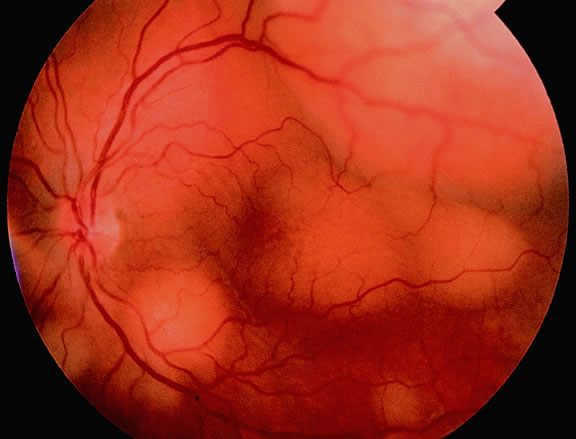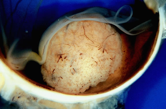 About 3% of melanomas have a diffuse growth pattern. These relatively flat tumors grow laterally without thickening the choroid.86,87 Most are about 2 mm in thickness. Diffuse melanomas often are of mixed cell type and, compared with localized lesions, are more apt to infiltrate the sclera and invade the optic nerve or orbit (Fig. 26). Delayed diagnosis or misdiagnosis is common.