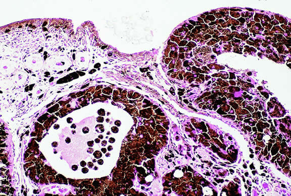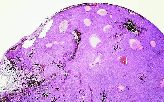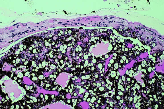 Uveal melanomas vary markedly in their pigment content. Some tumors are totally amelanotic; others are maximally pigmented. In some instances, distinct clones of tumor cells that vary in pigment content are evident on gross examination or even clinically (Fig. 25). A friable or granular appearance of the cut surface of a melanoma noted during gross examination may be indicative of necrosis or a tumor rich in poorly cohesive epithelioid cells. Melanomas that contain cystic cavities occasionally are encountered.85