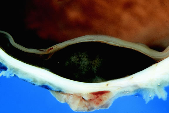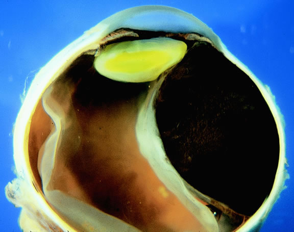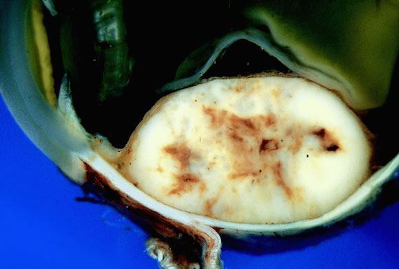 Today, relatively few eyes with metastatic carcinoma are accessioned by ophthalmic pathology laboratories because diagnosis is made clinically and most eyes are treated with radiotherapy and/or chemotherapy. Relief of pain is a major indication for enucleation of eyes with advanced disease. Macroscopically, the appearance of eyes with uveal metastases is somewhat variable. In most instances the uveal tract is diffusely thickened by an infiltrate of white, pink, or yellow tissue (Fig. 50). Metastases occasionally have a multinodular growth pattern, and a few larger lesions are oval in configuration (Fig. 51). Bruch's membrane almost always remains intact, however. Although there are exceedingly rare exceptions to the rule, one generally can conclude that a mushroom-shaped tumor of the choroid is a malignant melanoma.