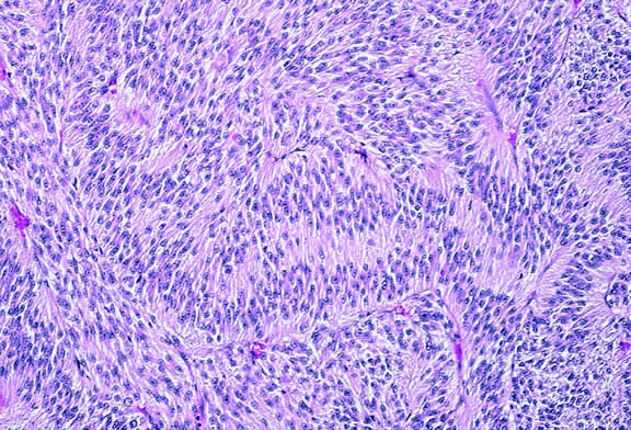 Histopathologically, the retinal angiomas appear identical to lesions of VHL disease that are called hemangioblastomas when they occur elsewhere in the CNS, particularly the cerebellum, spinal cord, and brainstem. In addition to capillary vessels, the tumors have a second population of stromal cells with foamy cytoplasm (Fig. 61). Atypical appearing glial cells also are common. Molecular genetic studies have demonstrated that loss of heterozygosity is confined to the stromal cells, suggesting that the latter actually are the neoplastic component in the tumors.240 Proliferation of capillaries is thought to be a secondary response to vascular endothelial growth factor (VEGF) produced by the stromal cells. The retinal hemangioblastomas are bilateral in 50% of cases. Patients who are diagnosed with retinal capillary hemangiomas and have VHL are, on average, almost 18 years younger than those without VHL disease.241 Approximately half of the patients presenting with a solitary retinal capillary hemangioma are expected to have underlying VHL disease; the risk progressively diminishes with increasing age at diagnosis.242 Patients with VHL disease are at risk for developing hemangioblastomas of the CNS, classically cystic tumors of the cerebellum. The tumor suppressor gene mutation also predisposes them to pheochromocytoma and retinal cell carcinoma. Clear cell renal cell carcinoma occurs in up to 70% of patients with VHL and is a frequent cause of death.239 Vasoproliferative Tumor of the Ocular Fundus Vasoproliferative tumor of the ocular fundus (VPTOF) is the term applied by Shields and associates183 to a vascularized fundus lesion that they sought to differentiate from retinal capillary hemangioma and melanoma. Generally these tumors appear ophthalmoscopically as an elevated reddish or yellow-pink mass that has a retinal feeding artery and draining vein. The vessels typically are not as dilated and tortuous as those associated with the retinal angiomas of VHL disease. Exudation is also characteristic but is located within the retina posterior to and continuous with the mass and does not have an affinity for the macula as does the Coats'-like exudative response seen in VHL disease. The authors initially suggested that VPTOF were acquired retinal hemangiomas, but they now believe that the lesion may be a reactive phenomenon and not a primary vascular neoplasm. Primary and secondary variants of VPTOF are recognized.183 The primary or idiopathic type generally is a unilateral, solitary lesion found in the inferotemporal fundus between the equator and the ora serrata. Affected patients often are hypertensive. The secondary type occurs in eyes that have predisposing conditions such as intermediate uveitis, retinitis pigmentosa, ocular toxocariasis, Coats' disease, chronic retinal detachment, and other conditions associated with chronic inflammation or ocular trauma. Scant histopathologic data suggest that the tumor is a reactive process rather than a true neoplasm.243,244 The tumefactions appear to be composed primarily of benign glial cell proliferation with secondary vasoproliferation. RPE hyperplasia is an additional component in some cases. Although some vasoproliferative tumors remain asymptomatic and some regress, others produce exudation and vitreous hemorrhage warranting cryotherapy, laser photocoagulation, or plaque brachytherapy.48,245 Local resection has been performed in several cases in which melanoma could not be excluded on clinical grounds.244 NEUROGENIC TUMORS A diffuse infiltrate of hamartomatous tissue may diffusely thicken the choroid in patients with von Recklinghausen's neurofibromatosis (NF-1). The infiltrate often contains increased numbers of melanocytes, which predispose to the development of uveal melanoma, and characteristic ovoid bodies composed of concentric lamellae of Schwann cells.93 Increased numbers of ganglion cells occur in some cases. A ganglioneuroma of the choroid has been reported in a young woman with NF-1.246 Benign peripheral nerve sheath tumors such as neurofibromas or schwannomas or neurilemomas are extremely rare uveal tumors that may be impossible to distinguish clinically from amelanotic malignant melanoma.247–250 Histopathologically, schwannomas generally are paucicellular compared with melanoma and may show palisading of nuclei (Fig. 62). Immunohistochemical data must be interpreted with care because these neural tumors, like melanomas, are immunoreactive for S-100 protein. They do not stain positively for other melanoma markers such as HMB-45 and melan A, however. A melanotic schwannoma of the choroid has been reported.251 NEUROECTODERMAL TUMORS IN ADULTS Most retinal tumors are retinoblastomas that occur in children before 3 years of age. However, older children may present with the relatively rare diffuse infiltrating form of retinoblastoma. Diffuse infiltrating retinoblastoma is universally unilateral and sporadic and the mean age of affected children is 6 years. Many cases are initially thought to have inflammation.252 An intraocular tumor should also be considered in a child with unilateral neovascular glaucoma. Medulloepithelioma generally is a pediatric neoplasm that presents at about age 4 years. Rare cases have been reported in adults, however.253 Most cases are ciliary body tumors.254,255 Benign and malignant and teratoid and nonteratoid variants occur. Teratoid medulloepitheliomas contain foci of heteroplastic tissue including cartilage, brain, and striated muscle. Exceptionally rare intraocular rhabdomyosarcoma reported in young adults may represent one-sided differentiation of malignant teratoid medulloepithelioma.256 Astrocytic hamartomas of the retina are a characteristic finding in patients with the tuberous sclerosis complex (TSC).257–259 In infancy, they may be very difficult to distinguish clinically from small retinoblastomas. Calcospherites often accumulate within maturing tumors giving rise to the appearance of mulberry n