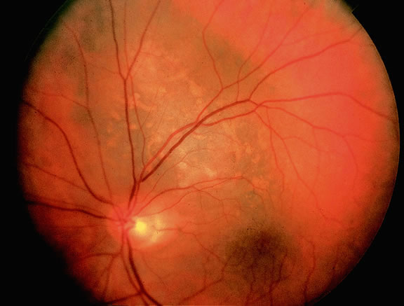 and is rare in heavily pigmented individuals. The choroidal vessels