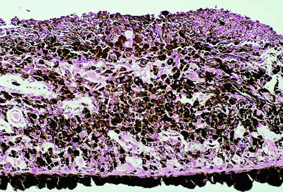 melanin pigment granules or melanosomes in the cytoplasm of the melanocytes.1 The pigment may protect against the development of uveal tumors, because