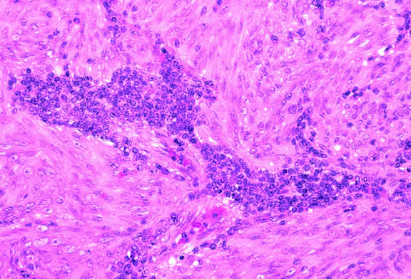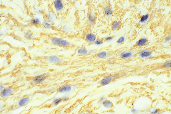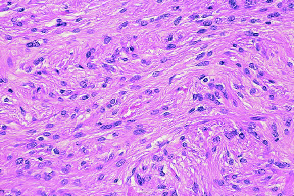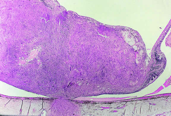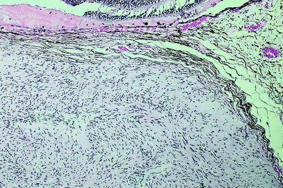 Recent studies have shown that the rare disorder previously called reactive lymphoid hyperplasia of the uvea probably is a form of lymphoma214,215 (Fig. 55). Affected patients may have massive infiltration of the uveal tract by low-grade non-Hodgkin's B cell lymphoma that may have germinal centers. Contiguous extraocular foci of tumor also may be present.216 The latter provide an opportunity to establish the diagnosis without an intraocular biopsy. Lymphoid tumors of the iris and choroid have been reported in immunosuppressed patients with posttransplantation lymphoproliferative disorder.217–219 The lymphoid tumors are caused by Ebstein Barr virus, and some improve if immunosuppression is reduced.219 Juvenile xanthogranuloma generally affects the iris stroma in infants but can infiltrate the posterior uvea.220 It is an important cause of spontaneous hyphema. The infiltrate contains Touton giant cells rimmed with lipid. Several cases of posterior uveal involvement by Letterer-Siwe disease have been reported.221,222 LEIOMYOMA Leiomyoma is a relatively rare nonpigmented tumor of the uveal tract that usually involves the ciliary body and typically affects young women.223,224 During transillumination, leiomyomas often transmit light vividly. The latter attribute, occurring in a young woman, should suggest that a nonpigmented ciliary body tumor may be a leiomyoma and not an amelanotic melanoma. Although leiomyoma is benign, local resection is recommended to prevent complications from the growing tumor.223 Histopathologically, leiomyoma is relatively paucicellular compared with amelanotic melanoma, and its cells have fibrillar eosinophilic cytoplasm and bland nuclei with finely dispersed chromatin (Fig. 56). Positive immunoreactivity for smooth muscle actin (Fig. 57) and other muscle markers serves to differentiate leiomyoma from uveal melanoma and rare neurogenic tumors such as schwannoma, which also are paucicellular. The latter distinction is important because some leiomyomas have a distinctly neural appearance on routine light microscopy. The term mesectodermal leiomyoma has been applied to such tumors, emphasizing the derivation of intraocular smooth muscle from neural crest.225