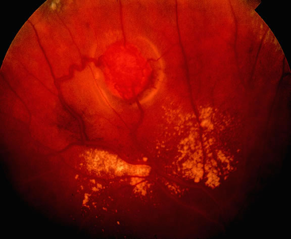 below. Non-neoplastic lesions that can be confused with melanoma include choroidal hemorrhage, age-related macular degeneration, peripheral disciform degeneration, massive gliosis, and idiopathic sclerochoroidal calcification. It is uncertain whether vasoproliferative tumors of the fundus are truly neoplastic.183 UVEAL METASTASES Although ocular oncologists see many more patients with uveal melanoma, metastatic nonocular cancer probably is the most common malignant intraocular neoplasm. A prospective postmortem study of 716 eyes obtained from patients who had malignant neoplasms at the time of death showed that the overall incidence of ocular metastases among all fatal cases of cancer was 9.3%.184 The total incidence of ocular metastases in patients dying of all types of carcinoma was 4.0%. The authors estimated that the incidence of ocular metastases is more than 10 times greater that the incidence of uveal melanoma. However, it must be emphasized that most of these secondary tumors occur in terminally ill patients, and few are detected clinically or referred to ophthalmologists. Most of the solid tumors that metastasize to the uvea are carcinomas; sarcomas rarely metastasize to the eye. Although any part of the eye may be involved by metastatic tumor, the uveal tract, especially the posterior part of the choroid, is affected most often (Fig. 48). A retrospective review of 520 eyes with uveal metastases in 420 patients evaluated by the Oncology Service at the Wills Eye Hospital during a 20-year period showed that 88% of 950 metastatic foci involved the choroid.185 The iris was involved in 9% and the ciliary body in 2%. Most of the choroidal metastases involved the macula (12%) or the region between the macula and the equator (80%). The posterior choroid is affected most often because its blood supply is greater. Metastases to the retina, vitreous, and optic disc are relatively uncommon.186–190 Choroidal metastases typically appear as yellow or creamy yellow, nummular, sessile dome- or plateau-shaped masses (see Fig. 48). A secondary serous retinal detachment usually is present. The metastases may be solitary or multiple and occasionally may involve both eyes. In a study by Shields and associates,185 29% of the eyes contained 2 or more metastases, and 17% contained three or more foci of metastatic tumor. Visual loss usually is caused by the exudative retinal detachment, which often has shifting subretinal fluid. Metastases usually are creamy yellow in color but can appear partially pigmented if necrosis has produced dispersion of uveal pigment. Metastases from skin melanomas are often grayish or brown. Metastases from carcinoid tumors, thyroid carcinoma, or renal cell carcinomas may be orange in color. Iris metastases appear as one or more yellow, pink, or white nodules in the iris stroma. The nodules are often friable and seed the aqueous humor with tumor cells simulating inflammation.191 A pseudohypopyon of tumor cells may develop, and secondary glaucoma is common. The nodules often contain blood vessels and hemorrhage may develop. Ciliary body metastases often involve the inferior quadrant and are difficult to visualize. They can produce inflammatory signs and simulate iridocyclitis.48 Ocular metastases from cutaneous melanoma often cause vitreous seeding by pigmented tumor cells.189,192,193 Retinal metastases are quite rare and can masquerade as an inflammatory process.48,186,187 Shields and colleagues190 have reported 30 patients who had metastatic tumors in the optic disc. Breast and lung carcinomas are the primary tumors that metastasize to the uvea most often and are responsible for more than two thirds of cases.185,194 Nearly half (47%) of the 420 patients reported by Shields and associates had breast carcinoma, and about one fifth (21%) had lung cancer. Other primary tumors included gastrointestinal tract (4%), kidney (2%), skin (2%), prostate (2%), and other cancers (4%).185 The primary tumor may be occult when the patient presents to the ophthalmologist. In Shields' series, one third of the patients had no history of a primary cancer at the time of ocular diagnosis. Subsequent evaluation showed that the occult primary tumor was lung carcinoma in 35% and breast carcinoma in 7%. However, no primary tumor was discovered in 51%. Women with metastases from breast carcinoma usually have a prior history of mastectomy; only 5% in the Shields' series presented with an occult mammary tumor. In contrast, metastasis often was the presenting manifestation of an occult lung cancer; only 45% of the cases with metastatic lung cancer were know to have cancer when the ocular diagnosis was made. Metastatic lung cancer is more common in men. The prognosis of patients with uveal metastasis generally is quite poor; the mean survival has been reported to be approximately 9 to 10 months.195,196 Treatment is recommended if the metastasis appears active and is threatening vision or the globe.185 Radiation therapy is recommended if the metastasis is symptomatic or continues to grow despite systemic chemotherapy. Plaque brachytherapy is advantageous compared with external beam radiotherapy because it can be delivered over a relatively short period of the patient's limited remaining life span. The diagnosis of intraocular metastasis usually is made by slit lamp biomicroscopy and ophthalmoscopy in the patient who has been carefully questioned about a past medical history of cancer. Ancillary techniques such as intravenous fluorescein angiography and ultrasonography often can assist in making the diagnosis. Metastases generally begin to show hyperfluorescence in the late venous phase fluorescein angiography, somewhat later than most melanomas or hemangiomas.48,54 Metastases have many acoustical interfaces because they are composed of nests, cords, and island of tumor cells surrounded by stroma. Hence, they show high internal reflectivity on A scan ultrasonography and appear acoustically solid in B scan, 