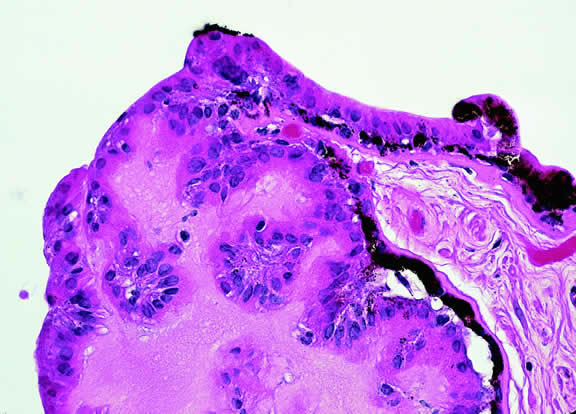 Primary acquired neoplasms occasionally arise from the retinal pigment epithelium and iris pigment epithelium and the pigmented and nonpigmented epithelia of the ciliary body. All of these layers are derived embryologically from the neuroectodermal optic cup. These neuroectodermal tumors include adenomas and adenocarcinomas. Adenomas of the iris pigment epithelium are sharply demarcated black tumors that push aside, rather than infiltrate, the iris stroma (Fig. 64). The cytoplasm of these exceedingly rare tumors contains large round pigment granules.261 Ciliary epithelial tumors (Figs. 65 to 69) can be predominantly pigmented or nonpigmented. Small pseudoadenomatous proliferations of the nonpigmented ciliary epithelium called Fuchs' or coronal adenomas are a common incidental finding in older adult eyes262,263 (see Figs. 65 and 66). The cytoplasm of many pigmented ciliary epithelial tumors contains multiple small cystoid spaces264 (see Fig. 67). Nonpigmented tumors are white or yellowish white in color and often produce focal cataract or lens dislocation. Many contain pools of hyaluronic acid, which can be extensive in some cases265 (see Figs. 68 and 69). In contrast to melanoma, which arises from the uveal stroma, ciliary epithelial tumors arise from the epithelium lining the inner surface of the ciliary body. Local resection usually is curative. Many ciliary epithelial tumors are benign, but malignant variants have been reported.265–271 Invasion, mitotic activity, and nuclear pleomorphism are signs of malignancy.