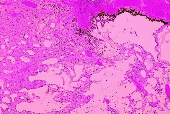 RETINAL PIGMENT EPITHELIAL TUMORS Primary neoplasms of the retinal pigment epithelium are exceedingly rare. This fact is somewhat surprising because the retinal pigment epithelium readily undergoes reactive hyperplasia and metaplasia forming extensive amounts of fibrous tissue and bone. Although amelanotic tumors have been reported, RPE tumors are typically jet black in color and have abruptly elevated margins. They often perforate the overlying retina and often are associated with retinal exudation. RPE tumors initially are situated on the inner surface of the choroid. Malignant variants can invade the choroidal stroma. It generally is thought that RPE carcinomas do not metastasize. Histopathologically, tumors arising from the anterior part of the retinal pigment epithelium have a vacuolated pattern similar to adenomas of the pigmented ciliary epithelium (Fig. 70). The cells of tumors arising from the posterior part of the retinal pigment epithelium are often arranged in strands and may form tubules or pseudoglands (Fig. 71). The cells typically rest on the surface of prominent PAS-positive connective-tissue septa.272 Epipapillary RPE adenoma may simulate optic disc melanocytoma.23