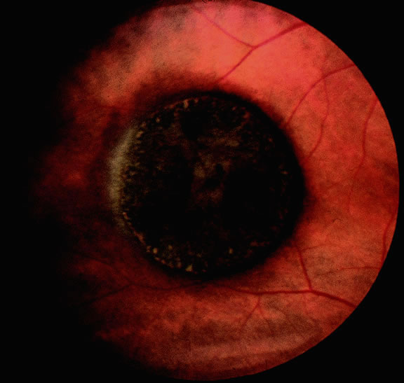 Nevi constitute the benign end of the biologic spectrum of melanocytic neoplasms. Most nevi are bland spindle cells tumors. Histopathologically, the choroidal stroma typically is replaced by a compact infiltrate of slender pigmented or nonpigmented spindle cells (Fig. 2). The nevus cells have bland oval or cigar-shaped nuclei that have finely dispersed chromatin and lack nucleoli or nuclear folds. Intranuclear cytoplasmic inclusions are common in some cases. Mitotic activity is absent. In some cases, the nevus cells are plump and dendritic in shape.9 Foamy balloon cells that appear to be undergoing lipoidal degeneration are found in 4% of nevi.4 Maximally pigmented, plump, polyhedral nevus cells comprise the magnocellular variant of nevus called melanocytoma (see later). Most pigmented tumors of the iris are low-grade spindle cell nevi that remain stationary and do not enlarge on follow-up (Fig. 3). The iris freckle is a small, stationary form of iris nevus that is found in half of the adult population.1