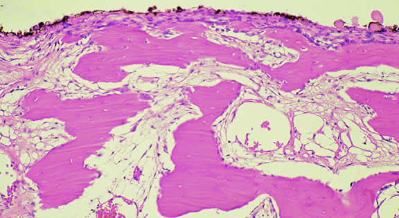 A variant of CHRPE is congenital grouped pigmentation (“bear tracks”).277 Recently, multiple bilateral pigmented RPE lesions that bear a superficial resemblance to CHRPE were reported as an ocular marker for the heritable cancer diathesis Gardner's syndrome (familial adenomatous polyposis with extracolonic manifestations).278,279 CHOROIDAL OSTEOMA Choroidal osteoma is a benign tumor composed of bone, which usually is found in young women.48,280 It may be unilateral or bilateral and may occur in siblings.281 Choroidal osteoma appears clinically as a yellow-orange placoid tumor with sharply defined scalloped margins (Fig. 75). It typically is located next to the optic disc or in the macula. Osteomas may enlarge,282 become decalcified,283,284 undergo spontaneous involution,285 or develop choroidal neovascularization.48 Osteomas may be confused ophthalmoscopically with metastases but are easily distinguished by ultrasonography, which shows a highly reflective plaque that persists at lower sensitivity, or by computed tomography that reveals a plaque with bone density. Serum calcium, phosphorus, and alkaline phosphatase levels usually are normal. The visual prognosis is unpredictable.286 Only a single case of choroidal osteoma has been examined histopathologically.287 A plaque of mature bone was found within the stroma of the choroid (Fig. 76). In contrast, bone is found on the inner surface of Bruch's membrane in osseous metaplasia of the retinal pigment epithelium, which is a relatively common occurrence in phthisical eyes with chronically detached retinas.