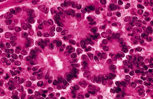outer segments. The presence of many Flexner-Wintersteiner rosettes in a tumor may have prognostic significance. In one series, patients who had moderately well-differentiated tumors that contained abundant Flexner-Wintersteiner rosettes had about a sixfold better prognosis than those whose tumors lacked rosettes. Flexner-Wintersteiner rosettes are more frequent in small, relatively early tumors and may be totally absent in large tumors, which usually are poorly differentiated. Flexner-Wintersteiner rosettes rarely are found in foci of metastatic retinoblastoma. Another less-differentiated type of rosette found in retinoblastoma was described by James Homer Wright (Fig. 17). Wright rosettes are indicative of neuroblastic differentiation. They lack a central lumen, and their constituent cells encompass a central tangle of neural filaments. Wright rosettes are relatively nonspecific. They also occur in neuroblastoma and are a characteristic feature of cerebellar medulloblastoma.