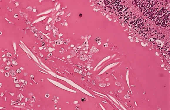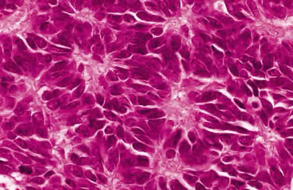 foci (Fig. 14). Viable parts of a retinoblastoma appear blue because they are composed of poorly differentiated neuroblastic cells that have scanty cytoplasm and intensely basophilic nuclei (Fig. 15). Many mitoses and fragments of apoptotic nuclear debris usually are present. Retinoblastoma grows rapidly and has a marked propensity to outgrow its blood supply and undergo spontaneous coagulative necrosis. This usually occurs when the proliferating cells have extended about 90 to 110 μm away from a blood vessel (see Fig. 15). The necrotic tumor cells lose their basophilic nuclear DNA and become pink or eosinophilic. The residual viable cells typically form cuffs or sleeves around vessels, imparting a multilobulated or papillary appearance to some tumors. These perivascular cuffs were called pseudorosettes by some in the past. Foci of dystrophic calcification develop in the necrotic parts of the tumor in many cases. Histopathologically, the calcific foci appear reddish-purple in hematoxylin-and-eosin sections, and the presence of calcium can be confirmed by the von Kossa or alizarin red stains. Electron microscopy suggests that calcification probably begins in the mitochondria of necrotic cells. Clinically, the demonstration of calcification by ultrasonography or computed tomography can help to differentiate retinoblastoma from other simulating lesions. Intensely basophilic deposits of DNA released from necrotic tumor cells are another characteristic histopathologic feature of retinoblastoma. DNA deposition generally is found in eyes with extensively necrotic tumors. Typically, the DNA deposits surround retinal or iris vessels or are found in the trabecular meshwork or in basement membranes such as the lens capsule or the internal limiting membrane of the retina. |
