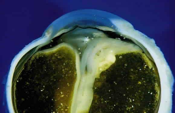 In the past, the clinical differentiation of retinoblastoma from other benign simulating lesions was somewhat academic because both typically occurred in blind eyes and were treated by enucleation. Although enucleation is always psychologically abhorrent, it did not have major functional consequences in such cases. Diagnostic accuracy has become increasingly important in recent years, however, because chemotherapy is being used as primary therapy for some cases of retinoblastoma. In addition, some common simulating lesions, such as persistent hyperplastic primary vitreous (PHPV), are now treated surgically. Another reason to avoid unnecessary enucleation in infancy is the orbital hypoplasia and deforming facial asymmetry that often result from surgical anophthalmia. It must be strongly emphasized, however, that diagnostic enucleation remains the only prudent therapeutic choice if the diagnosis is at all uncertain. Many lesions that simulate retinoblastoma produce leukocoria. The causes of the white pupillary reflex in such cases include opacification of the lens, retrolenticular fibrosis, retinal detachment, material in the vitreous cavity, or depigmented lesions in the posterior retina or choroid. The three most common simulating lesions are toxocariasis, PHPV, and Coats' disease. TOXOCARIASIS Inflammatory disorders can simulate retinoblastoma, and retinoblastoma occasionally is misdiagnosed initially as inflammation. Endophytic or diffuse infiltrative retinoblastomas typically seed the vitreous humor and occasionally the anterior chamber, forming a pseudohypopyon of tumor cells. The most common inflammatory disease that simulates retinoblastoma is ocular toxocariasis, particularly the nematode endophthalmitis form of the disorder (Fig. 19). Representing about one fourth of cases, presumed ocular toxocariasis was the most common simulating lesion in Shields' series of 76 cases of pseudoretinoblastomas. Leukocoria in toxocariasis results from the accumulation of inflammatory cells or debris in the vitreous and mimics endophytic retinoblastoma.
