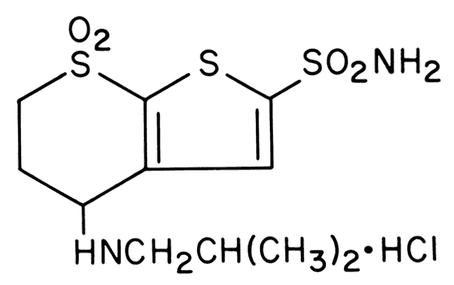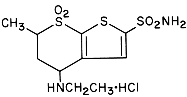 such complaints. TOPICAL CARBONIC ANHYDRASE INHIBITORS Since the 1950s, numerous investigators75–79 have attempted to formulate a topically active CAI that would have fewer side effects than the currently prescribed systemic formulations. The systemically administered CAIs that are effective ocular hypotensive agents (e.g., acetazolamide, methazolamide, ethoxzolamide, dichlorphenamide) were relatively ineffective when administered topically. Various modifications of these systemically active agents that were evaluated for topical use include trifluoromethazolamide, a derivative of methazolamide that reduced IOP in rabbits75,76 but was unstable in solution and required a long duration of ocular exposure; aminozolamide gel, an analogue of ethoxzolamide that significantly reduced IOP in patients with ocular hypertension77 but had substantial ocular side effects when administered chronically78; and L-650,719, another sulfonamide derivative that reduced IOP in rabbits79 but failed to reduce IOP in a clinical trial of normotensive volunteers.80 In the 1980s, a series of thienothiopyran-2sulfonamide compounds were developed that are effective in reducing IOP when administered topically. These compounds are sulfonamide derivatives,81–83 as is acetazolamide, and they differ from other CAIs previously investigated for topical use in that they are water soluble, are stable in solution, have excellent corneal penetration, and inhibit CA at low concentrations, which can be achieved with topical application. Three thienothiopyran-2-sulfonamide derivatives have been identified that reduce IOP after topical administration in laboratory and clinical trials: MK-927, which is a racemic mixture (Fig. 1); sezolamide (MK-417), which is the S-enantiomer of MK-927 (Fig. 2); and dorzolamide, a compound structurally similar to MK-927 and sezolamide, which has previously been identified as MK-507 and L-671,152 (Fig. 3).