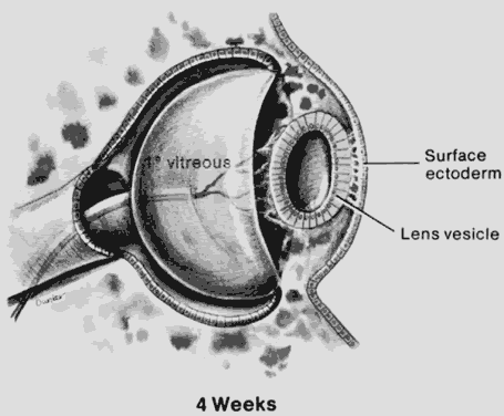 differentiation. LENS DIFFERENTIATION Between days 24 and 26, the surface ectoderm adjacent to the optic vesicle thickens, forming the lens plate (placode). The lens placode invaginates to form the lens vesicle, which has a hollow center, between days 32 and 33 (Fig. 1). The lens vesicle consists of a single layer of cells whose apices are directed toward the center. After the lens vesicle has detached from the surface ectoderm, it is surrounded by a basal lamina, which will become the lens capsule. Primary aphakia results when the lens plate is absent.6 A lens that forms but subsequently degenerates and largely disappears leads to secondary aphakia.6 If the lens plate forms normally, cuboidal cells line the anterior part of the lens vesicle. The posterior portion of the vesicle is lined by columnar cells that form the primary fibers. These fibers fill the lens vesicle, obliterating its cavity, and create an arc across the lens anterior to the equator. The anterior lens epithelial cells remain cuboidal and become the permanent lens epithelium that, through mitosis, gives rise to future cortical lens fibers later in life. By the seventh week of development, secondary fibers begin to proliferate in both directions from the equatorial region of the lens. The secondary fibers interlace anteriorly to produce an upright Y suture and posteriorly to produce an inverted Y suture. The lens continues to grow throughout a person's life through the proliferation of secondary lens fibers. As the fibers are laid down, the different optical densities of the fibers produce four zones of discontinuity that can be observed clinically with a slit lamp: