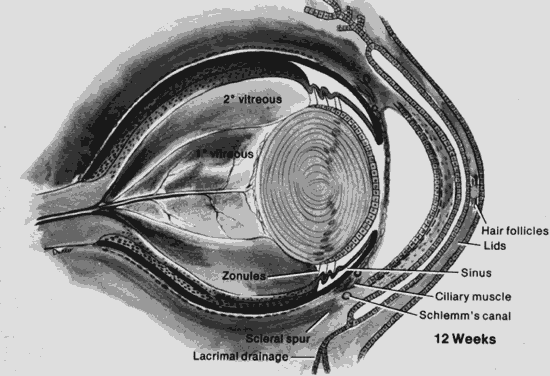 The third period of vitreous formation begins at the end of the third month. The tertiary vitreous begins as an accumulation of collagen fibers between the equator of the lens and the optic cup and will eventually differentiate into the vitreous base and lens zonules. SCLERAL DIFFERENTIATION The sclera is derived from tissue of neural crest origin. Most of the cornea is derived from the same mesenchymal tissue with the exception of the corneal epithelium, which is derived from surface ectoderm. The anterior sclera forms first as a condensation of this tissue and is continuous with the cornea. Condensation proceeds posteriorly until the 12th week of development, at which time the sclera surrounds the optic nerve. CORNEAL DIFFERENTIATION The lens vesicle detaches from the overlying surface ectoderm during the sixth week of gestation. During the seventh week, a single layer of neural crest cells invades the region between the surface ectoderm and the lens vesicle. This single layer of cells will differentiate into the corneal endothelium. A second wave of neural crest cells migrates between the primitive endothelium and surface ectoderm to form fibroblasts. These fibroblasts will eventually differentiate into keratoblasts that will produce the collagen fibrils and extracellular matrix of the corneal stroma.8–10 Initially these neural crest cells occupy the space that will become the anterior chamber. They are the precursor cells that will develop into the corneal stroma, corneal endothelium, anterior iris stroma, and many of the structures of the iridocorneal angle. The surface ectoderm will give rise to the corneal epithelium. The anterior chamber is formed when these neural crest cells separate from the tunica vasculosa lentis and pupillary membrane, which overlie the anterior lens surface. Therefore, the anterior chamber is almost entirely derived from neural crest cells, not mesoderm as was once believed. The vascular endothelium is now thought to be the only component of the anterior segment that is derived from mesoderm. The corneal epithelium is derived from surface ectoderm, whereas the remainder of the cornea is derived from neural crest cells, as described previously. The corneal stroma gives rise to Bowman's membrane. Therefore, Bowman's membrane is of neural crest origin and is a condensation of anterior corneal stroma. It is not the basement membrane of the corneal epithelium and is not derived from the same precursor cells. Descemet's membrane is present by the sixth month of gestation and the cornea begins to become transparent at about this time. IRIS AND CILIARY BODY DIFFERENTIATION During the third month of development, the anterior rim of the optic cup, which is composed of neural ectoderm, begins growing rapidly in a curve around the anterior surface of the lens. The iris pigmented and nonpigmented epithelium will develop from this anterior advancing edge of the optic cup. The iris sphincter and dilator muscles develop from these epithelial layers and are the only muscles of the body that are derived from neural ectoderm. The inner epithelial layer begins to develop folds, which are the early ciliary processes. The ciliary body epithelium also develops from the anterior portion of the optic cup. The tertiary vitreous forms from an extracellular matrix that is produced by the ciliary epithelium and will eventually become the lens zonules. The iris stroma develops from the neural crest cells, which migrate between the lens vesicle and surface ectoderm. IRIDOCORNEAL ANGLE DIFFERENTIATION Traditionally, the study of the development of the anterior chamber and angle has concentrated on the role of mesenchyme. It is now known that neural crest cells are the major contributor to the development of these structures. There continues to be some controversy, however, regarding the mechanism by which the angle is formed. There are conflicting opinions as to whether the angle structures are formed as a result of simple cleavage of the iris root from the cornea, or whether a more active growth process is required for normal angle development. OPTIC NERVE DIFFERENTIATION The optic nerve develops within the substance of the optic stalk. The nerve fibers of the developing optic nerve are composed of axons of the ganglion cells in the retina. The nerve fibers completely fill the optic stalk by the end of the seventh week. Myelination of the nerve fibers starts at the chiasm at about 7 months and progresses anteriorly toward the eye. Myelination normally stops at the lamina cribrosa approximately 1 month after birth. Myelinated nerve fibers occur if the myelination process continues past the lamina and most likely represents ectopic myelination, not a structural defect in the lamina cribrosa. EYELID AND LACRIMAL APPARATUS DIFFERENTIATION The eyelids develop from both surface ectoderm and neural crest cells. Surface ectoderm gives rise to the epidermis, cilia, and conjunctival epithelium, while the deeper structures of the lids, including the dermis and tarsus, are derived from neural crest cells. The orbicularis and levator muscles develop from mesoderm. The eyelids begin to form by 6 weeks and grow to cover the eye. The upper and lower folds fuse at approximately 12 weeks and gradually start to separate at 6 months' gestation. The lacrimal apparatus is formed by contributions from the lateral nasal and maxillary processes as well as from the lids. During the third month, the lacrimal canaliculus is formed by the lysis of a central core of cells. The lacrimal punctum opens onto the lid margin just before the lids separate, usually during the seventh month. The lower end of the nasolacrimal duct is frequently separated from the cavity of the inferior meatus at birth by a membrane. This membrane consists of the opposed mucosal linings of the nasal fossa and the lower end of the duct. Obstruction of the nasolacrimal duct is usually caused by defective canalization or persistence of the nasa