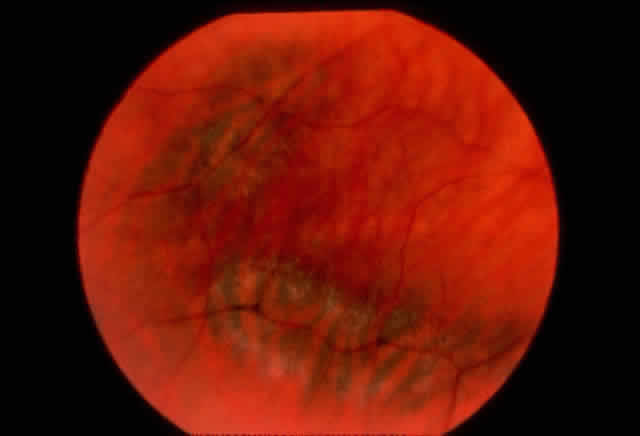CHOROIDEREMIA The recent discovery of the molecular defect in choroideremia is an excellent example of the power of molecular studies in advancing our understanding of disease pathogenesis. Choroideremia is a hereditary, bilateral, and progressive X-linked retinal degeneration characterized by central blindness in affected males during early adulthood. These patients have hemeralopia, decreased vision, and visual field constriction due to atrophy of the choroid and the retinal pigment epithelium (Fig. 6). One notable characteristic of choroideremia in contrast with other retinal degenerations, such as X-linked retinitis pigmentosa, is that carrier females of choroideremia have a typical fundus appearance consisting of linear retinal pigmentation with punctate area of pigment epithelial atrophy.
