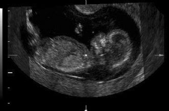 Nuchal edema is an echo-free space between the skin line and the soft tissue overlying the cervical spine. Nuchal edema is caused by subcutaneous accumulation of fluid and has diverse etiology, including aneuploidies, cardiovascular and pulmonary defects, skeletal dysplasias, congenital infections, and hematologic and metabolic disorders. A nuchal translucency (NT) is obtained between 10 and 13 weeks' 6 days' gestational age (Fig. 8).31 A study at King's College Hospital in London found an NT of 3 mm was associated with a 4-times increase in the maternal age related risk for aneuploidy. An NT greater than 4 mm resulted in a 29 times increased risk for trisomies 21, 18, and 13. Additionally, with a 4 mm or more NT, there was a high incidence of other anomalies and poor prognosis, whereas with just 3 mm and a normal karyotype, the outcome was usually normal. Table 8 lists the disorders associated with an increased nuchal translucency thickness.