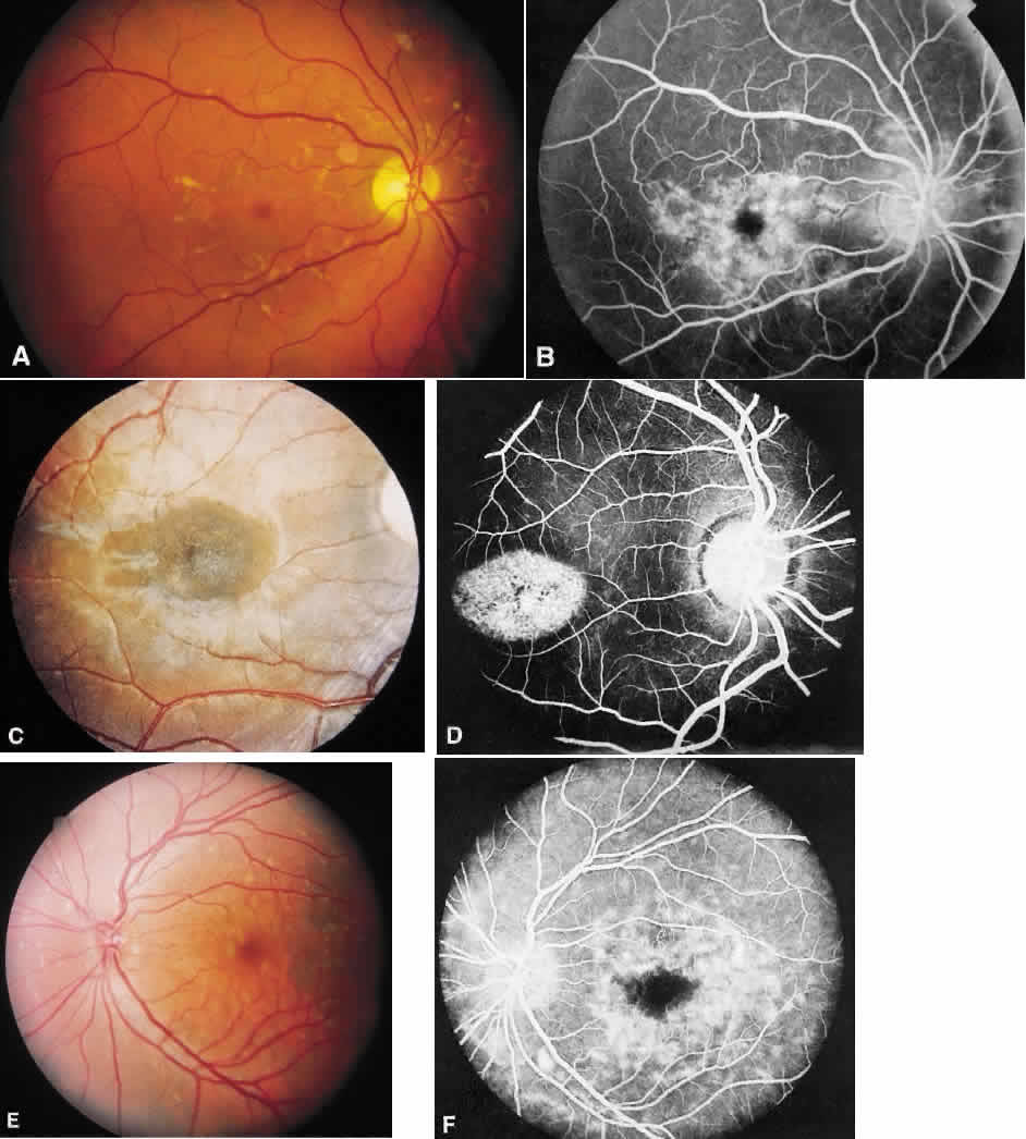 funduscopically (Fig. 5).66 With progression of the disease, the chorioretinal atrophy is obvious, and in the late stages, a few large choroidal vessels may be seen coursing over the white sclera. The yellowish appearance of these vessels prompted the conjecture that choroidal vas-cular “sclerosis” was the primary cause. However, histopathology has clearly shown no evidence of vessel wall sclerosis, but rather a well-delineated macular zone of atrophy of the choriocapillaris.67–70 In the early stages of central areolar choroidal dystrophy, the finding of nonspecific macular pigmentary abnormalities can mimic a variety of macular diseases (e.g., Stargardt's disease, vitelliform dystrophy, progressive cone dystrophy, and acquired macular degenerations). The later appearance of macular chorioretinal atrophy can also be mistaken for a healed chorioretinitis, atrophic nonexudative acquired macular degeneration, and the late stages of other hereditary dystrophies. Therefore, the diagnosis of central areolar choroidal dystrophy should be suspected when there is dominant inheritance with family members showing the various morphologic stages, bilateral symmetric macular lesions in all affected members without drusen or flecks, choriocapillaris atrophy on angiography of all affected members, and a normal ERG. |