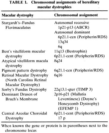X. Wang, Leonard B. Nelson, and Larry A. Donoso. The eye in general and the hereditary chorioretinal dystrophies in particular are uniquely well suited to benefit from this revolution for a number of reasons. First, the eye remains the only organ of the body that is easily accessible for complete direct visualization. This allows for accurate and well-documented morphology of the chorioretinal pathology. Second, there are an entire array of noninvasive diagnostic tests (see chapters on Ancillary Diagnostic Techniques) that provide finer discrimination in characterizing these diseases. In addition, historically, there have been a number of well-documented, large family pedigrees who have been carefully worked up and are now available for study. Linkage analysis with multiple highly polymorphic marker loci has been successful in chromosomal assignment. Finally, an understanding of the normal visual process, specifically phototransduction, and of the retinal anatomic architecture has identified proteins of potential importance. For a number of these proteins, the gene has been identified and sequenced. This permits screening of families or individuals to identify whether or not a mutation has occurred in one of these candidate genes. The chromosomal loci of a number of the hereditary macular dystrophies have been determined by the methods of linkage analysis and by the candidate gene approach. The chromosomal assignments and, in some cases, the gene are known for many of these hereditary macular dystrophies and are listed in Table 1.