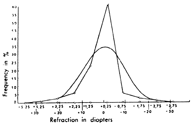 Since each component of refraction follows a normal binomial curve, it would be reasonable to assume that total refraction, the sum of these components, would also be distributed in a normal binomial curve. However, studies by Scheerer,10 Betsch,11 and Franceschetti12 have shown a leptokurtic distribution of refractive error in the measurements of 12,000 eyes when high myopia is omitted (Fig. 1).