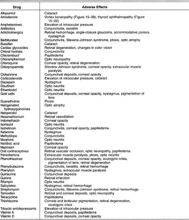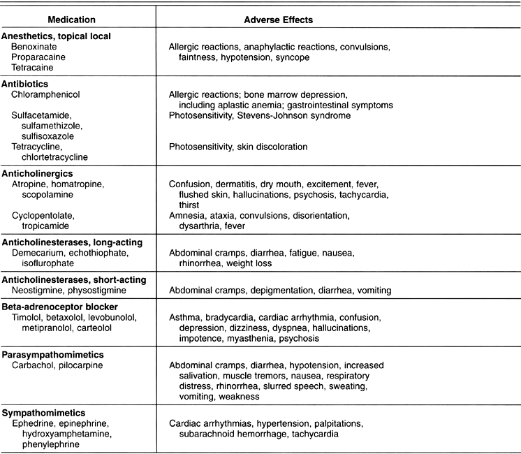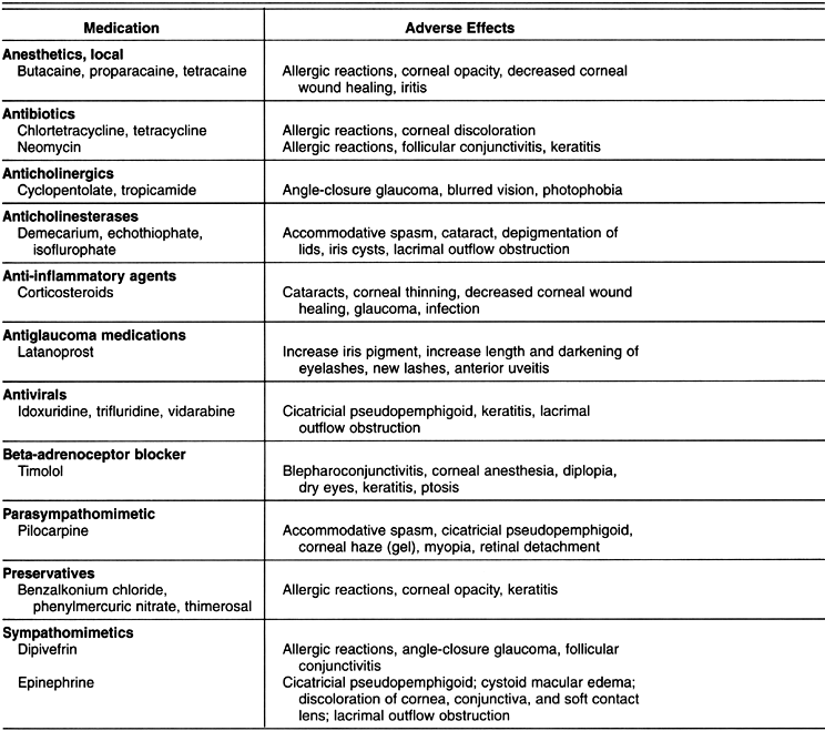 Ocular drugs administered both systemically and topically can produce adverse ocular effects, and topical ophthalmic preparations may lead to systemic side effects. Preservatives in topical ocular medications may also be associated with side effects.
