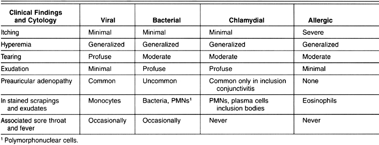 Chapter 5: Conjunctiva CONJUNCTIVITIS DUE TO INFECTIOUS AGENTS The types of conjunctivitis and their commonest causes are set forth in Tables 5-1 and 5-2. Because of its location, the conjunctiva is exposed to many microorganisms and other stressful environmental factors. Several mechanisms protect the surface of the eye from external substances: In the tear film, the aqueous component dilutes infectious material, mucus traps debris, and a pumping action of the lids constantly flushes the tears to the tear duct; the tears contain antimicrobial substances, including lysozyme and antibodies (IgG and IgA). Common pathogens that can cause conjunctivitis include Streptococcus pneumoniae, Haemophilus influenzae, Staphylococcus aureus, Neisseria meningitidis, most human adenovirus strains, herpes simplex virus type 1 and type 2, and two picornaviruses. Two sexually transmitted agents that cause conjunctivitis are Chlamydia trachomatis and Neisseria gonorrhoeae. Cytology of Conjunctivitis Damage to the conjunctival epithelium by a noxious agent may be followed by epithelial edema, cellular death and exfoliation, epithelial hypertrophy, or granuloma formation. There may also be edema of the conjunctival stroma (chemosis) and hypertrophy of the lymphoid layer of the stroma (follicle formation). Inflammatory cells, including neutrophils, eosinophils, basophils, lymphocytes, and plasma cells, may be seen and often indicate the nature of the damaging agent. The inflammatory cells migrate from the conjunctival stroma through the epithelium to the surface. They then combine with fibrin and mucus from the goblet cells to form the conjunctival exudate, which is responsible for the "mattering" on the lid margins (especially in the morning). The inflammatory cells appear in the exudate or in scrapings taken with a sterile platinum spatula from the anesthetized conjunctival surface. The material is stained with Gram's stain (to identify the bacterial organisms) and with Giemsa's stain (to identify the cell types and morphology). A predominance of polymorphonuclear leukocytes is characteristic of bacterial conjunctivitis. Generally, a predominance of mononuclear cells-especially lymphocytes-is characteristic of viral conjunctivitis. If a pseudomembrane or true membrane is present (eg, epidemic keratoconjunctivitis or herpes simplex virus conjunctivitis), neutrophils then predominate because of coexistent necrosis. In chlamydial conjunctivitis, neutrophils and lymphocytes are usually present in equal numbers. In allergic conjunctivitis, eosinophils and basophils are frequently present in conjunctival biopsies, but they are less common on conjunctival smears; eosinophils or eosinophilic granules are commonly found in vernal keratoconjunctivitis. High levels of proteins secreted by eosinophils (eg, eosinophil cationic protein) can be found in the tears of patients with vernal, atopic, or allergic conjunctivitis. Eosinophils and basophils are found in allergic conjunctivitis, and scattered eosinophilic granules and eosinophils are found in vernal keratoconjunctivitis. In all types of conjunctivitis, there are plasma cells in the conjunctival stroma. They do not migrate through the epithelium, however, and are therefore not seen in smears of exudate or of scrapings from the conjunctival surface unless the epithelium has become necrotic, as it may in trachoma; in this event, the rupturing of a follicle allows the plasma cells to reach the epithelial surface. Since the mature follicles of trachoma rupture easily, the finding of large, pale-staining lymphoblastic (germinal center) cells in scrapings strongly suggests trachoma. Symptoms of Conjunctivitis The important symptoms of conjunctivitis are a foreign body sensation, a scratching or burning sensation, a sensation of fullness around the eyes, itching, and photophobia. Foreign body sensation and a scratching or burning sensation are often associated with the swelling and papillary hypertrophy that normally accompany conjunctival hyperemia. If there is pain, the cornea is probably also affected. Pain of the iris or ciliary body is also suggestive of corneal involvement. Signs of Conjunctivitis (Table 5-2) The important signs of conjunctivitis are hyperemia, tearing, exudation, pseudoptosis, papillary hypertrophy, chemosis, follicles, pseudomembranes and membranes, granulomas, and preauricular adenopathy. Hyperemia is the most conspicuous clinical sign of acute conjunctivitis. The redness is most marked in the fornix and diminishes toward the limbus by virtue of the dilation of the posterior conjunctival vessels. (A perilimbal dilation or ciliary flush suggests inflammation of the cornea or deeper structures.) A brilliant red suggests bacterial conjunctivitis, and a milky appearance suggests allergic conjunctivitis. Hyperemia without cellular infiltration suggests irritation from physical causes such as wind, sun, smoke, etc, but may occur occasionally with diseases associated with vascular instability (eg, acne rosacea). Tearing (epiphora) is often prominent in conjunctivitis, the tears resulting from the foreign body sensation, the burning or scratching sensation, or the itching. Mild transudation also arises from the hyperemic vessels and adds to the tearing. An abnormally scant secretion of tears and an increase in mucous threads suggests keratoconjunctivitis sicca. Exudation is a feature of all types of acute conjunctivitis. The exudate is flaky and amorphous in bacterial conjunctivitis and stringy in allergic conjunctivitis. "Mattering" of the eyelids occurs upon awakening in almost all types of conjunctivitis, and if the exudate is copious and the lids are firmly stuck together, the conjunctivitis is probably bacterial or chlamydial. Pseudoptosis is a drooping of the upper lid secondary to infiltration of Müller's muscle. The condition is seen in several types of severe conjunctivitis, eg, trachoma and epidemic keratoconjunctivitis. Papillary hypertrophy i