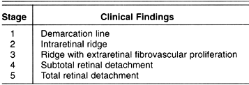 Chapter 10: Retina DISEASES OF THE PERIPHERAL RETINA RETINAL DETACHMENT The term "retinal detachment" denotes separation of the sensory retina, ie, the photoreceptors and inner tissue layers, from the underlying retinal pigment epithelium. There are three main types: rhegmatogenous detachment, traction detachment, and serous or hemorrhagic detachment. 1. RHEGMATOGENOUS RETINAL DETACHMENT The most common of the three major types of retinal detachments is rhegmatogenous retinal detachment. The characteristics of a rhegmatogenous detachment are a full-thickness break (a "rhegma") in the sensory retina, variable degrees of vitreous traction, and passage of liquefied vitreous through the sensory retinal defect into the subretinal space. A spontaneous rhegmatogenous retinal detachment is usually preceded or accompanied by a posterior vitreous detachment. Myopia, aphakia, lattice degeneration, and ocular trauma are associated with this type of retinal detachment. Binocular indirect ophthalmoscopy with scleral depression ( Treatment Scleral buckling or pneumatic retinopexy are the two most popular and effective surgical techniques for the repair of rhegmatogenous retinal detachment. Each procedure requires careful localization of the retinal break and treatment with cryotherapy or laser in order to create an adhesion between the pigment epithelium and the sensory retina. With scleral buckling surgery, the retinal break is mounted on sclera indented by an explant. The scleral indentation can be achieved by a variety of techniques and materials, each of which has inherent advantages and disadvantages. Pneumatic retinopexy involves the intraocular injection of air or an expandable gas in order to tamponade the retinal break while the chorioretinal adhesion forms. An overall reattachment rate of 90% is reported; however, the visual results are dependent on the preoperative status of the macula. If the macula is involved in rhegmatogenous retinal detachment, the likelihood of complete visual recovery is slight. 2. TRACTION RETINAL DETACHMENT Traction retinal detachment is the second most common type and is most commonly due to proliferative diabetic retinopathy, proliferative vitreoretinopathy, retinopathy of prematurity, or ocular trauma. In contrast to the convex appearance of rhegmatogenous retinal detachment, the typical traction retinal detachment has a more concave surface and is likely to be more localized, usually not extending to the ora serrata. The tractional forces that actively pull the sensory retina away from the underlying pigment epithelium are caused by a clinically apparent vitreal, epiretinal, or subretinal membrane consisting of fibroblasts and of glial and retinal pigment epithelial cells. In diabetic traction retinal detachment, vitreous contraction draws the fibrovascular tissue and underlying retina anteriorly toward the vitreous base. Initially the detachment may be localized along the vascular arcades, but progression may spread to involve the midperipheral retina and the macula. Proliferative vitreoretinopathy is a complication of rhegmatogenous retinal detachment and is the most common cause of failure of surgical repair in these eyes. The basic pathologic process in eyes with proliferative vitreoretinopathy is growth and contraction of cellular membranes on both sides of the retina and on the posterior vitreous surface. Focal traction from cellular membranes can produce a retinal tear and lead to combined tractional-rhegmatogenous retinal detachment. Treatment The primary treatment of traction retinal detachment is vitreoretinal surgery and may involve vitrectomy, membrane removal, scleral buckling, and injection of intraocular gas or silicone oil. 3. SEROUS & HEMORRHAGIC RETINAL DETACHMENT Serous and hemorrhagic retinal detachment can occur in the absence of either retinal break or vitreoretinal traction. These detachments are the result of a collection of fluid beneath the sensory retina and are caused primarily by diseases of the retinal pigment epithelium and choroid. Degenerative, inflammatory, and infectious diseases limited to the macula, including the multiple causes of subretinal neovascularization, may be associated with this third type of retinal detachment and are described in an earlier section of this chapter. This type of detachment may also be associated with systemic vascular and inflammatory disease as described in Chapters 7 and 15. RETINOPATHY OF PREMATURITY Retinopathy of prematurity is a vasoproliferative retinopathy that is the leading cause of childhood blindness in the United States and a major cause of blindness throughout the developed world. An international classification of this disease divides the retina into three zones and characterizes the extent of disease by the number of clock hours involved; the retinal changes are divided into five stages described in Table 10-2. The demarcation line is a narrow white band that marks the junction of vascular and avascular retina in stage 1; it is the first definite ophthalmoscopic sign of retinopathy of prematurity. As this band increases in height, width, and volume and rises up from the plane of the retina, the ridge of stage 2 is seen. Neovascular proliferation along the posterior aspect of the ridge and extending into the vitreous defines stage 3. Stage 4 is characterized by subtotal retinal detachment, and the clinical sign of stage 5 is a funnel-shaped total retinal detachment. Treatment The treatment of retinopathy of prematurity is based on the classification and stage of the disease. It is important to note that a significant number of patients with retinopathy of prematurity undergo spontaneous regression. Peripheral retinal changes of regressed retinopathy of prematurity include avascular retina, peripheral folds, and retinal breaks; associated changes in the posterior pole may include straightening of the temporal vessels, temporal stretching of the macula, and retinal tissue that appear