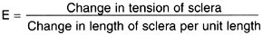 An inflated surgical glove or balloon (Figure 11-2) illustrates this relationship. The palm of the glove has relatively high tension and the thumb relatively low tension, though the pressure within the glove is equal at all locations. The thumb has low tension because the radius of curvature is small and the thickness large relative to the same factors at the palm. In the eye, tension is lower in the cornea or optic cup than in the sclera. An eye under slowly increasing pressure usually ruptures beneath the lateral rectus where the sclera is thinner, as the tension equation would suggest. A precipitous pressure rise due to trauma (eg, a blow from a club) frequently ruptures the eye at the limbus owing to the anvil effect of the more viscous vitreous. C. Strain: Strain is stretch or displacement per unit length. A strain gauge measures displacement. Strain can result in damage and in the body can cause both pain and damage. Using the belt analogy, strain is the stretch per unit length of the belt resulting from the tension in the belt caused by the pressure of the abdomen. Young's modulus E is used for determining the elastic properties of structures such as cables, pressure vessels, submarines, biologic cells, unicellular organisms, and eyes. E is defined as the tension required to stretch a material of unit cross section to double its original length. This is represented by the following equation: