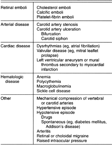 Chapter 15: Ocular Disorders Associated With Systemic Diseases Authors: Examination of the eye provides the ophthalmologist an opportunity to make a unique contribution to the diagnosis of systemic disease. Nowhere else in the body can a microcirculatory system be investigated with such precision, and nowhere else are the results of minute focal lesions so devastating. Many systemic diseases involve the eyes, and therapy demands some knowledge of the vascular, rheologic, and immunologic nature of these diseases. VASCULAR DISEASE NORMAL ANATOMY & PHYSIOLOGY The blood supply to the eye is from the ophthalmic artery, which is the first branch of the internal carotid artery (see Chapter 1). The first branches of the ophthalmic artery are the central retinal artery and the long posterior ciliary arteries. The retina is perfused by retinal and choroidal vessels that provide contrasting anatomic and physiologic circulations. The retinal arteries correspond to arterioles in the systemic circulation. They function as end arteries and feed a capillary bed consisting of small capillaries (7 PATHOLOGIC APPEARANCES IN RETINAL VASCULAR DISEASE Hemorrhages Retinal hemorrhages result from diapedeses from veins or capillaries, and the morphologic appearances depend upon the size, site, and extent of damage to the vessel (Figure 15-1). Hemorrhages may be caused by any condition that alters the integrity of the endothelial cells. They usually indicate some abnormality of the retinal vascular system, and systemic factors should be considered in relation to (1) vessel wall disease (eg, hypertension, diabetes), (2) blood disorders (eg, leukemia, polycythemia), and (3) reduced perfusion (eg, carotid cavernous fistula, acute blood loss). A. Preretinal Hemorrhages: These result from damage to the superficial disk or retinal vessels and are usually large, producing a gravity-dependent fluid level. B. Linear Hemorrhages: These usually small hemorrhages lie in the superficial nerve fiber layers and hence have a characteristic linear appearance, conforming to the alignment of nerve fibers in any particular area of the fundus. C. Punctate Hemorrhages: Hemorrhages situated deeper in the substance of the retina are punctate and derived from capillaries and smaller venules. The circular appearance is related to the anatomic arrangement of structures in the retina. D. Subretinal Hemorrhages: These hemorrhages are less common because normally there are no blood vessels between the retina and the choroid. Such hemorrhages are large and red, with a well-defined margin and no fluid level. They are seen in relation to the disk and in any condition where abnormal vessels pass from the choroidal circulation into the retina. E. Hemorrhages Under the Pigment Epithelium: Hemorrhages situated under the pigment epithelium are usually dark and large, so that they must be differentiated from choroidal melanomas and hemangiomas. F. White Central Hemorrhages (Roth's Spots): Superficial retinal hemorrhages with pale or white centers are not pathognomonic of any disease process but may arise in a variety of circumstances: (1) retinal infarction (cotton-wool spot) with surrounding hemorrhage; (2) retinal hemorrhage in combination with extravasation of white corpuscles (eg, leukemia); and (3) retinal hemorrhage with central resolution. Acute Ocular Ischemia A. Optic Disk Infarction (Anterior Ischemic Optic Neuropathy): Impairment of the blood supply to the optic disk produces sudden visual loss, usually with an altitudinal field defect and pallid swelling of the optic disk. The primary abnormality is complete or partial interruption of the choroidal blood supply to the disk, while the retinal capillaries on the surface of the disk appear dilated. Fluorescein angiography confirms the circulatory alterations ( B. Choroidal Infarction: This is extremely rare, though certain clinical appearances have been attributed to ciliary vessel occlusion. These include small pale areas in the equatorial region that resolve to leave mottled pigmentary areas (Elschnig's spots) due to necrosis of the pigment epithelium. Larger infarcts may occur and may be triangular or linear (Figure 15-3). C. Retinal Infarction: The funduscopic appearance of arteriolar occlusion depends on the size of the vessel occluded, the duration of occlusion, and the time course. Occlusion of major arterioles produces a total, hemispheric, or segmental pallid swelling of the retina. Occlusion of a precapillary retinal arteriole produces the pathognomonic appearance of a cotton-wool spot ( D. Transient Retinal Ischemia (Amaurosis Fugax): Transient episodes of monocular visual loss lasting 5-10 minutes are characteristic of amaurosis fugax. Patients often describe a curtain coming down from above or across their vision, usually with complete return of vision within seconds or minutes. Paresthesias in the contralateral limbs localize the disorder to the carotid artery and suggest involvement of the ophthalmic artery and middle cerebral artery. It is important for the ophthalmologist to auscultate the carotid for a systolic bruit and to search the fundus for emboli. Amaurosis fugax is most commonly due to retinal emboli, of which there are three main types. 1. Cholesterol emboli- These so-called Hollenhorst plaques usually arise from an atheromatous plaque in the carotid artery and consist of cholesterol and fibrin. They lodge at the bifurcation of retinal arterioles, are refractile, and may appear larger than the vessel that contains them ( 2. Calcific emboli- Originating from damaged cardiac valves, these emboli lodge within the arteriole, producing complete occlusion and infarction of the distal retina. Calcific emboli are solid and calcified and occur in younger patients with a variety of cardiac lesions. 3. Platelet-fibrin emboli- Most cases of amaurosis fugax are probably due to the transit of platelet aggregates through the retinal and choroidal circulations. The emboli are usuall