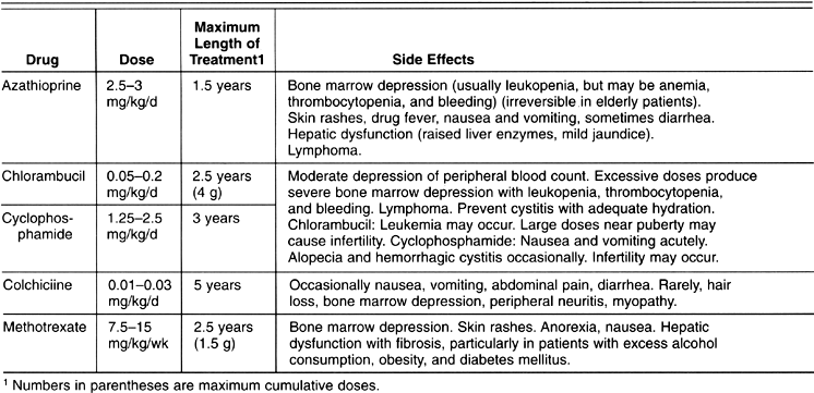 Chapter 15: Ocular Disorders Associated With Systemic Diseases IMMUNOSUPPRESSIVE AGENTS USED IN MANAGEMENT OF EYE DISEASE Immunosuppressive agents are used to suppress inflammatory reactions within the eye, particularly those affecting the uveal tract but also the sclera, retina, and optic nerve. Frequently, the cause of inflammation is not known, and the use of these drugs is therefore empirical. All patients must have a full medical examination before treatment is started. Special consideration must be given to patients with infections and blood diseases, and regular blood counts must be performed during the course of treatment. Corticosteroids (eg, prednisolone) are the mainstay of immunosuppressive treatment in ophthalmology. High doses (eg, 60 mg of prednisolone daily) may be required to control inflammation, and there is a high incidence of side effects. Weight gain, acne, and hirsutism are common; peptic ulceration, myopathy, osteoporosis, and avascular necrosis are less frequently encountered. Alternate-day regimens produce fewer side effects in some patients. Azathioprine may be added as a corticosteroid-sparing drug; 2.5 mg/kg daily is an effective dose, and the total course should not last longer than 18 months. Intravenous methylprednisolone (1 g/d given over 3 hours in dextrose saline for 3 days) is an effective method of controlling exacerbations in patients already taking high doses of corticosteroids. Cyclosporine is an immunosuppressive agent isolated from the fermentation products of a fungus that was recovered from Norwegian soil. It has an effective immunomodulating action and causes suppression of T helper cells. It is a useful alternative drug for refractory sight-threatening noninfectious inflammatory eye disease in patients who have not responded to corticosteroids or in whom the optimal therapeutic dose of corticosteroids is associated with intolerable side effects. The recommended dose is 5 mg/kg orally daily. The most important side effect is renal toxicity, but liver toxicity may also occur. Close surveillance and monitoring of kidney and liver function are mandatory on every patient receiving cyclosporine therapy. The drug should not be given to hypertensive patients. Reduction of the daily dose may be associated with troublesome rebound of the ocular inflammation. Fortunately, cytotoxic agents are rarely indicated in the management of inflammatory eye disease except in severe cases of Beh·et's syndrome and Wegener's granulomatosis. These drugs and their important side effects are listed in Table 15-3. Cytotoxic agents are sometimes used in the treatment of myasthenia gravis (see Figure 15-36). PREVIOUS | NEXT Page: 1 | 2 | 3 | 4 | 5 | 6 | 7 | 8 | 9 | 10 | 11 | 12 | 13 | 14 | 15 | 16 | 17 10.1036/1535-8860.ch15 |