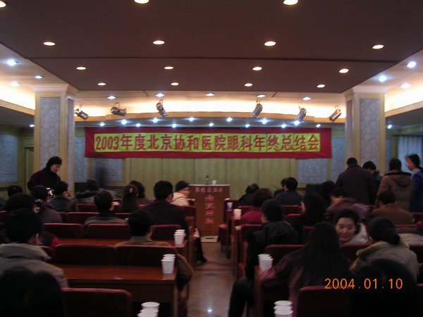 2004年1月10日,北京协和医院眼科一行70余人在渤海之滨的渤海度假村召开了2003年科年终总结会。经过3小时的长途奔波,到达目的地稍事休息之后,在会议中心举行了全体员工的年终总结会。赵家良主任首先总结了2003年全年眼科的工作情况,获得两项北京市科技进步二等奖,一项中华医学会科技奖二等奖。获得两项国家自然科学研究基金、数项北京市卫生研究基金和医院的科研启动基金。因为SARS的影响,全年的临床工作量较2002年有所减少,但开辟了全新的眼视光治疗中心,完成了多项外援任务,举办了第二届眼科住院医生日,为住院医生的培训开辟了新的思路,产生了广泛的影响。最后赵家良教授并展望了2004年眼科的初步发展规划和设想,包括完善住院医生培训制度、扩大眼科临床工作规模和外单位广泛联系等。然后颁发了2003年在国内外眼科专业杂志上发表文章医生的奖金、对获得各项国家、北京市和医院奖励的医生的奖金。会后举行了丰盛的晚宴,眼科老专家、教授们纷纷上台发言,表达了对眼科工作支持和眼科未来发展的展望。
